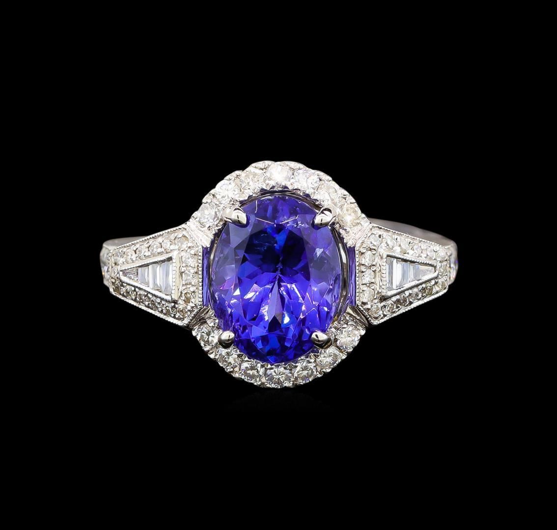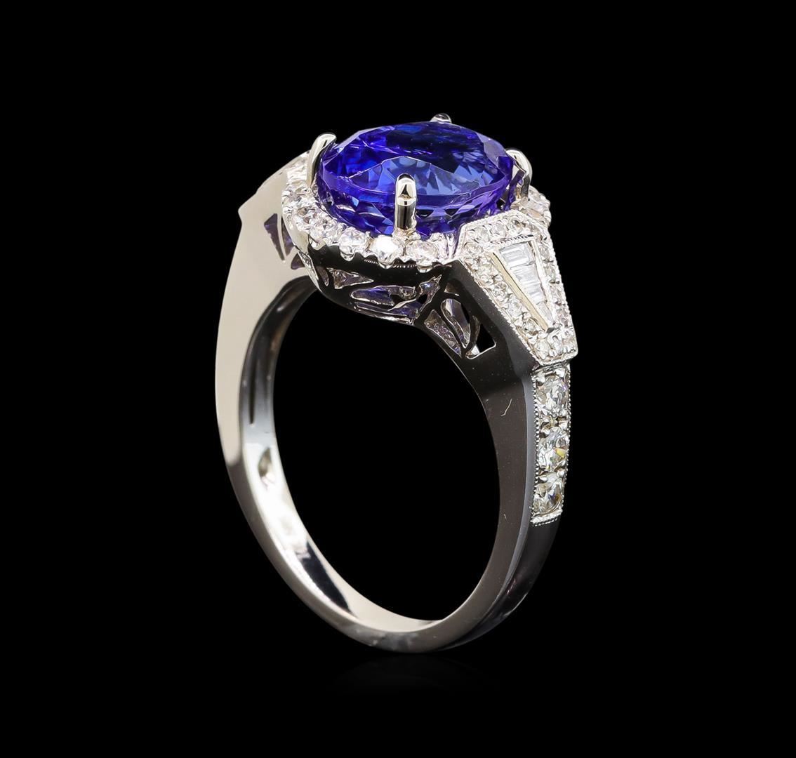 One electronically tested 14KT white gold ladies cast tanzanite and diamond ring with a flat shank with a bright polish finish. Trademark is UCG. Identified with markings of "14K 585". Condition is new. Containing: One prong set oval modified brilliant cut natural tanzanite, measuring 10.30 x 8.50 x 7.33mm, approximate weight of 4.51ct., clarity is eye clean, type I, medium, moderately strong, bluish violet color, (GIA bV 5/4), cut is good. Fourteen prong set round brilliant cut diamonds, measuring 2.00 - 2.00 x 1.20mm (depth est.) approximate total weight of 14 Stones = 0.41ct. Clarity: SI-2 to I-1. Color: I - J, Cut is Good. Thirty-Two prong set round brilliant cut diamonds, measuring 1.00 - 1.00 x 0.60mm (depth est.) approximate total weight of 32 Stones = 0.12ct. Clarity: I-1 to I-2. Color: I - J. Eight channel set baguette cut diamonds, measuring from 1.10 x 1.10 x 0.94mm (depth est.) to 1.80 x 1.20 x 1.02mm (depth est.) approximate total weight of 8 Stones = 0.12ct. Clarity: SI-1. Color: I - J. All diamonds and colored gemstones are graded in the mounting, unless otherwise stated. Colored gemstones are presumed to have been subjected to commonly used enhancement processes. Total Weight of Colored Stones 4.51ct. Total Weight of Diamonds 0.64ct. Total Weight of Ring 5.70 grams. GGL Appraised.