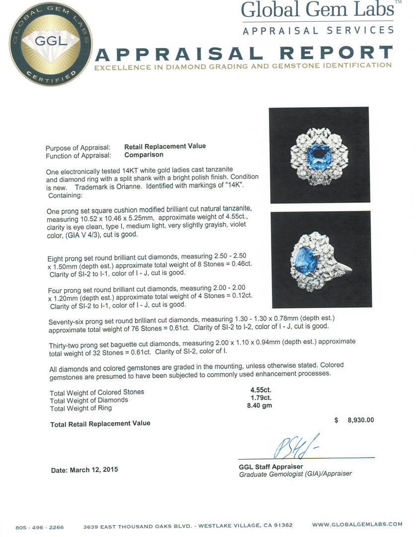 One electronically tested 14KT white gold ladies cast tanzanite and diamond ring with a split shank with a bright polish finish. Trademark is Orianne. Identified with markings of "14K". Condition is new. Containing: One prong set square cushion modified brilliant cut natural tanzanite, measuring 10.52 x 10.46 x 5.25mm, approximate weight of 4.55ct., clarity is eye clean, type I, medium light, very slightly grayish, violet color, (GIA V 4/3), cut is good. Eight prong set round brilliant cut diamonds, measuring 2.50 - 2.50 x 1.50mm (depth est.) approximate total weight of 8 Stones = 0.46ct. Clarity: SI-2 to I-1. Color: I - J, Cut is Good. Four prong set round brilliant cut diamonds, measuring 2.00 - 2.00 x 1.20mm (depth est.) approximate total weight of 4 Stones = 0.12ct. Clarity: SI-2 to I-1. Color: I - J, Cut is Good. Seventy-Six prong set round brilliant cut diamonds, measuring 1.30 - 1.30 x 0.78mm (depth est.) approximate total weight of 76 Stones = 0.61ct. Clarity: SI-2 to I-2. Color: I - J, Cut is Good. Thirty-Two prong set baguette cut diamonds, measuring 2.00 x 1.10 x 0.94mm (depth est.) approximate total weight of 32 Stones = 0.61ct. Clarity: SI-2. Color: I. All diamonds and colored gemstones are graded in the mounting, unless otherwise stated. Colored gemstones are presumed to have been subjected to commonly used enhancement processes. Total Weight of Colored Stones 4.55ct. Total Weight of Diamonds 1.79ct. Total Weight of Ring 8.40 grams. GGL Appraised.