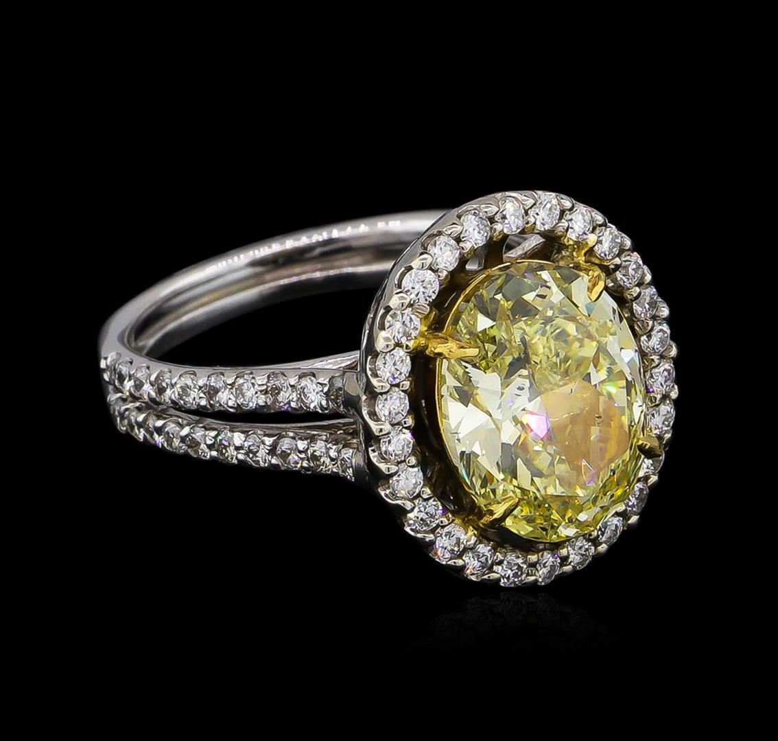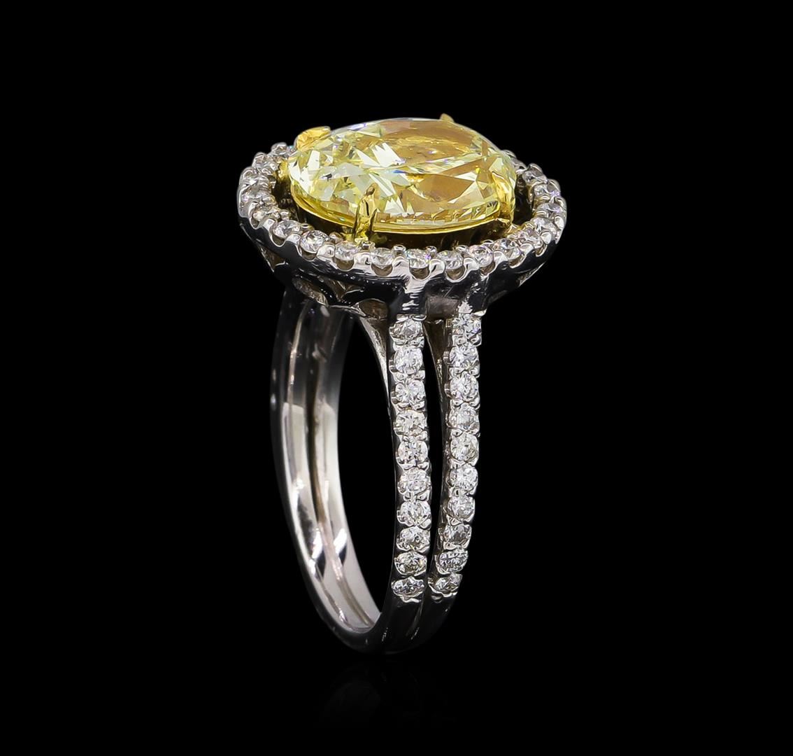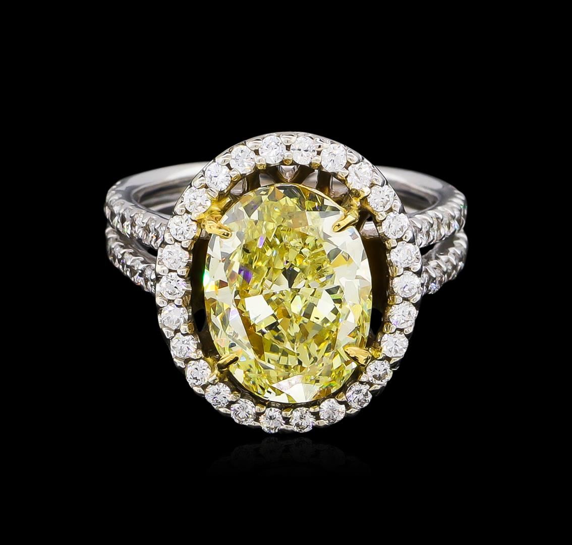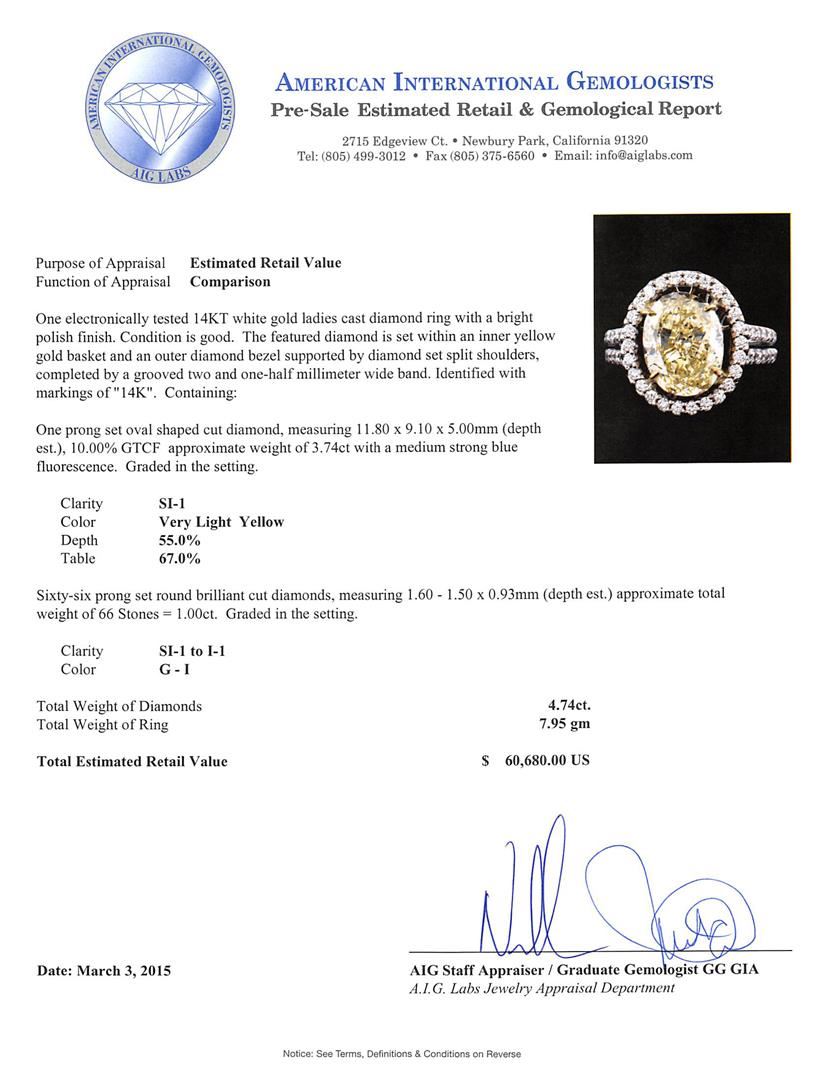 One electronically tested 14KT white gold ladies cast diamond ring with a bright polish finish. The featured diamond is set within an inner yellow gold basket and an outer diamond bezel supported by diamond set split shoulders, completed by a grooved two and one-half millimeter wide band. Identified with markings of "14K". Condition is good. Containing: One prong set oval shaped cut diamond, measuring 11.80 x 9.10 x 5.00mm (depth est.), 10.00.%. GTCF approximate weight of 3.74ct with a medium strong blue fluorescence. Graded in the setting. Clarity: SI-1. Depth: 55.0%. Table 67.0%. Sixty-Six prong set round brilliant cut diamonds, measuring 1.60 - 1.50 x 0.93mm (depth est.) approximate total weight of 66 Stones = 1.00ct. Graded in the setting. Clarity: SI-1 to I-1. Color: G - I. Total Weight of Diamonds 4.74ct. Total Weight of Ring 7.95 grams. AIG Appraised at $60,680.00.