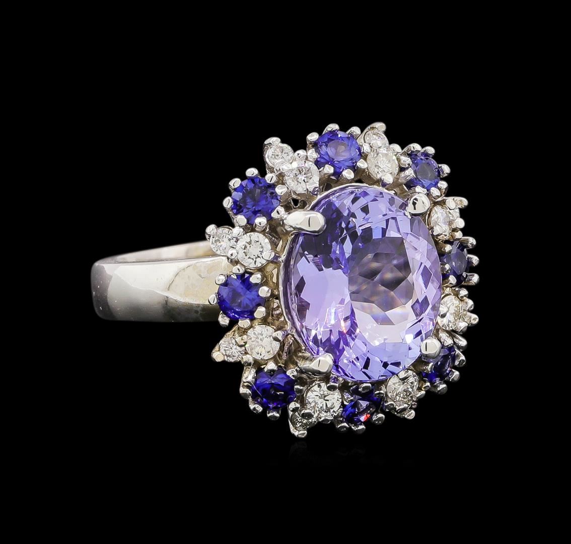 One electronically tested 14KT white gold ladies cast tanzanite, sapphire and diamond ring with a bright polish finish. Identified with markings of "K14". Condition is new. Containing: One prong set oval modified brilliant cut natural tanzanite, measuring 11.50 x 9.50 x 6.18mm, approximate weight of 4.75ct., clarity is eye clean, type I, medium light, very slightly grayish, violet color, (GIA V 4/3), cut is good. Eight prong set round modified brilliant cut natural blue sapphires, measuring 2.60 - 2.60 x 1.69 mm, approximate total weight of 0.72ct., clarity is slightly included, type II, medium, moderately strong, blue color, (GIA B 5/4), cut is good. Sixteen prong set round brilliant cut diamonds, measuring 1.90 - 1.50 x 1.02mm (depth est.) approximate total weight of 16 Stones = 0.29ct. Clarity: SI-1 to I-1. Color: I - J, Cut is Good. Colored gemstones are presumed to have been subjected to commonly used enhancement processes. All diamonds and colored gemstones are graded in the mounting, unless otherwise stated. Total Weight of Colored Stones 5.47ct. Total Weight of Diamonds 0.29ct. Total Weight of Ring 7.70 grams. GGL Appraised.