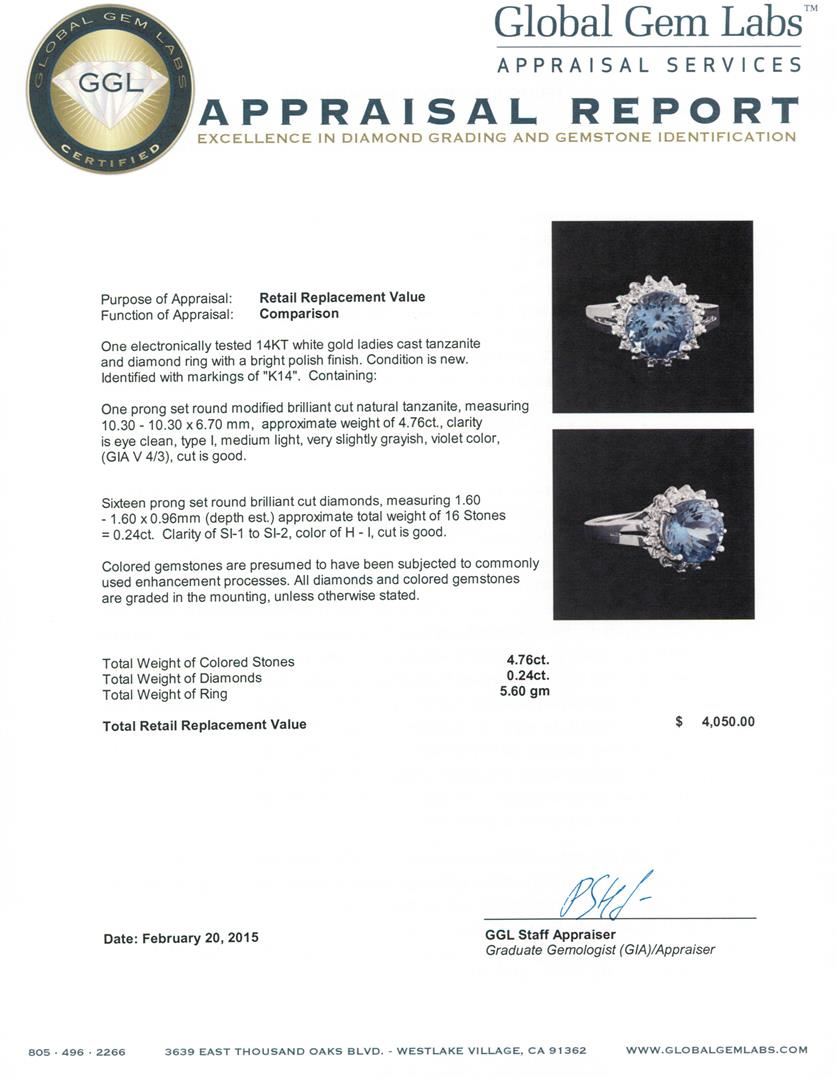 One electronically tested 14KT white gold ladies cast tanzanite and diamond ring with a bright polish finish. Identified with markings of "K14". Condition is new. Containing: One prong set round modified brilliant cut natural tanzanite, measuring 10.30 - 10.30 x 6.70 mm, approximate weight of 4.76ct., clarity is eye clean, type I, medium light, very slightly grayish, violet color, (GIA V 4/3), cut is good. Sixteen prong set round brilliant cut diamonds, measuring 1.60 - 1.60 x 0.96mm (depth est.) approximate total weight of 16 Stones = 0.24ct. Clarity: SI-1 to SI-2. Color: H - I, Cut is Good. Colored gemstones are presumed to have been subjected to commonly used enhancement processes. All diamonds and colored gemstones are graded in the mounting, unless otherwise stated. Total Weight of Colored Stones 4.76ct. Total Weight of Diamonds 0.24ct. Total Weight of Ring 5.60 grams. GGL Appraised.