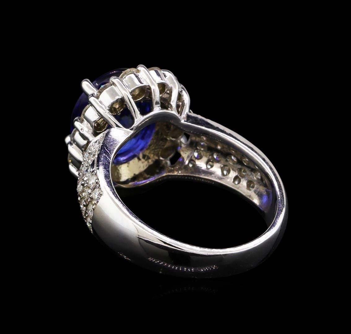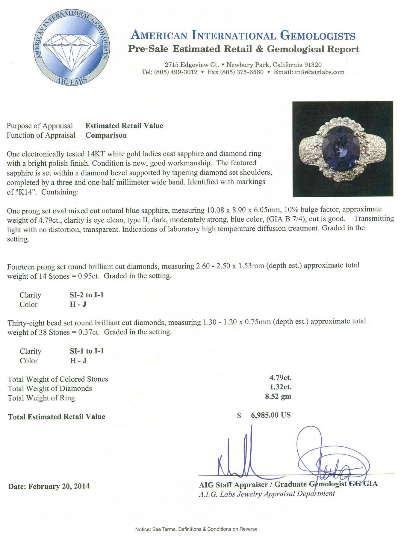 One electronically tested 14KT White Gold ladies cast sapphire and diamond ring with a bright polish finish. Condition is new, good workmanship. The featured sapphire is set within a diamond bezel supported by tapering diamond set shoulders, completed by a three and one-half millimeter wide band. Identified with markings of "K14". Containing: One prong set oval mixed cut natural blue sapphire, measuring 10.08 x 8.90 x 6.05mm, 10%. bulge factor, approximate weight of 4.79ct., clarity is eye clean, type II, dark, moderately strong, blue color, (GIA B 7/4), cut is good. Transmitting light with no distortion, transparent. Indications of laboratory high temperature diffusion treatment. Graded in the setting. Fourteen prong set round brilliant cut diamonds, measuring 2.60 - 2.50 x 1.53mm (depth est.) approximate. Total Weight of 14 Stones = 0.95ct. Graded in the setting. Clarity: SI-2 to I-1. Color: H - J Thirty-Eight bead set round brilliant cut diamonds, measuring 1.30 - 1.20 x 0.75mm (depth est.) approximate. Total Weight of 38 Stones = 0.37ct. Graded in the setting. Clarity: SI-1 to I-1. Color: H - J. Total Weight of Colored Stones 4.79ct. Total Weight of Diamonds 1.32ct. Total Weight of Ring 8.52 grams. AIG Appraised.