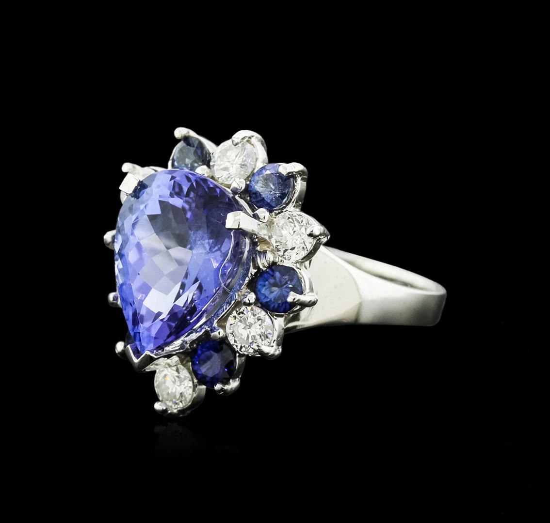 One electronically tested 14KT white gold ladies cast tanzanite, sapphire and diamond ring with a bright polish finish. Identified with markings of "14K". Condition is new. Containing: One prong set pear modified brilliant cut natural tanzanite, measuring 13.00. x 9.20 x 5.99mm, approximate weight of 4.80ct., clarity is eye clean, type I, medium light, moderately strong, violet color, (GIA V 4/4), cut is good. Six prong set round modified brilliant cut natural blue sapphires, measuring 3.00. - 3.00. x 1.96 mm, approximate total weight of 0.84ct., clarity is moderately included, type II, medium, moderately strong, blue color, (GIA B 5/4), cut is good. Six prong set round brilliant cut diamonds, measuring 3.40 - 3.40 x 2.04mm (depth est.) approximate total weight of 6 Stones = 0.86ct. Clarity: SI-1 to SI-2. Color: I - J, Cut is Good. Colored gemstones are presumed to have been subjected to commonly used enhancement processes. All diamonds and colored gemstones are graded in the mounting, unless otherwise stated. Total Weight of Colored Stones 5.64ct. Total Weight of Diamonds 0.86ct. Total Weight of Ring 6.20 grams. GGL Appraised at $5,720.00.