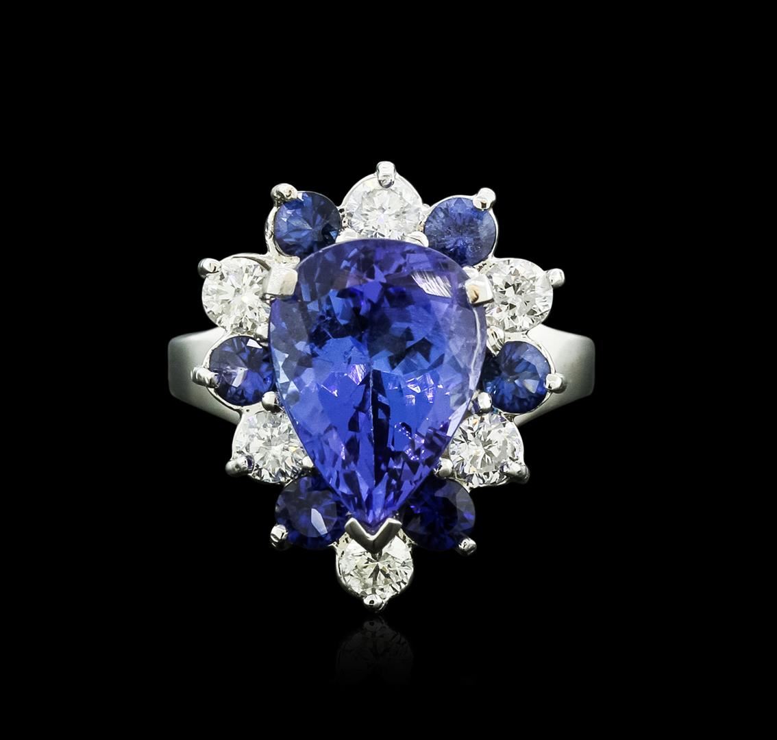 One electronically tested 14KT white gold ladies cast tanzanite, sapphire and diamond ring with a bright polish finish. Identified with markings of "14K". Condition is new. Containing: One prong set pear modified brilliant cut natural tanzanite, measuring 13.00. x 9.20 x 5.99mm, approximate weight of 4.80ct., clarity is eye clean, type I, medium light, moderately strong, violet color, (GIA V 4/4), cut is good. Six prong set round modified brilliant cut natural blue sapphires, measuring 3.00. - 3.00. x 1.96 mm, approximate total weight of 0.84ct., clarity is moderately included, type II, medium, moderately strong, blue color, (GIA B 5/4), cut is good. Six prong set round brilliant cut diamonds, measuring 3.40 - 3.40 x 2.04mm (depth est.) approximate total weight of 6 Stones = 0.86ct. Clarity: SI-1 to SI-2. Color: I - J, Cut is Good. Colored gemstones are presumed to have been subjected to commonly used enhancement processes. All diamonds and colored gemstones are graded in the mounting, unless otherwise stated. Total Weight of Colored Stones 5.64ct. Total Weight of Diamonds 0.86ct. Total Weight of Ring 6.20 grams. GGL Appraised.