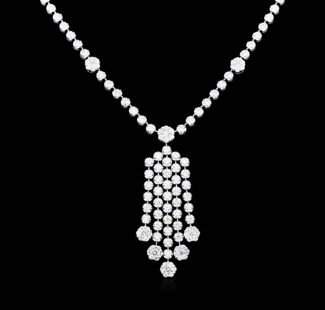 One electronically tested 14KT white gold ladies combination cast & assembled diamond necklace with a hidden box clasp with safety closer with a bright polish finish. Identified with markings of "14K". Condition is new. Containing: Eighty-Eight prong set round brilliant cut diamonds, measuring 2.30 - 2.30 x 1.38mm (depth est.) approximate total weight of 88 Stones = 3.92ct. Clarity: SI-2 to I-1. Color: I - J, Cut is Good. Sixty prong set round brilliant cut diamonds, measuring 1.60 - 1.60 x 0.96mm (depth est.) approximate total weight of 60 Stones = 0.89ct. Clarity: SI-2 to I-1. Color: I - J, Cut is Good. All diamonds are graded in the mounting, unless otherwise stated. Total Weight of Diamonds 4.81ct. Total Weight of Necklace 27.60 grams.
