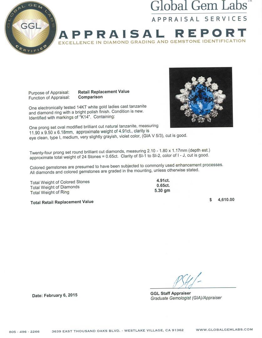 One electronically tested 14KT white gold ladies cast tanzanite and diamond ring with a bright polish finish. Identified with markings of "K14". Condition is new. Containing: One prong set oval modified brilliant cut natural tanzanite, measuring 11.90 x 9.50 x 6.18mm, approximate weight of 4.91ct., clarity is eye clean, type I, medium, very slightly grayish, violet color, (GIA V 5/3), cut is good. Twenty-Four prong set round brilliant cut diamonds, measuring 2.10 - 1.80 x 1.17mm (depth est.) approximate total weight of 24 Stones = 0.65ct. Clarity: SI-1 to SI-2. Color: I - J, Cut is Good. Colored gemstones are presumed to have been subjected to commonly used enhancement processes. All diamonds and colored gemstones are graded in the mounting, unless otherwise stated. Total Weight of Colored Stones 4.91ct. Total Weight of Diamonds 0.65ct. Total Weight of Ring 5.30 grams. GGL Appraised.