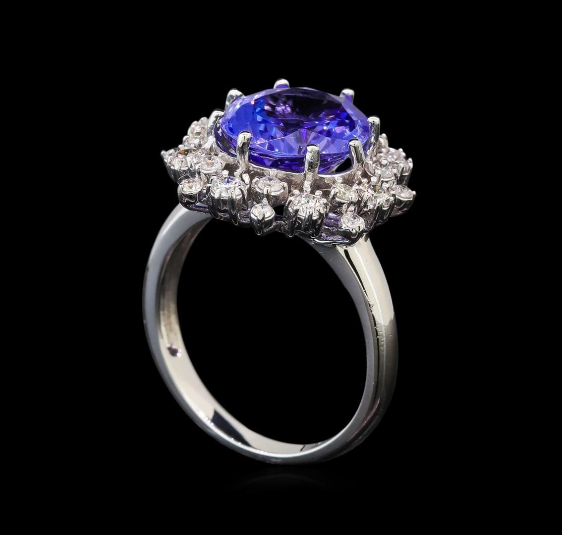 One electronically tested 14KT white gold ladies cast tanzanite and diamond ring with a bright polish finish. Identified with markings of "K14". Condition is new. Containing: One prong set oval modified brilliant cut natural tanzanite, measuring 11.90 x 9.50 x 6.18mm, approximate weight of 4.91ct., clarity is eye clean, type I, medium, very slightly grayish, violet color, (GIA V 5/3), cut is good. Twenty-Four prong set round brilliant cut diamonds, measuring 2.10 - 1.80 x 1.17mm (depth est.) approximate total weight of 24 Stones = 0.65ct. Clarity: SI-1 to SI-2. Color: I - J, Cut is Good. Colored gemstones are presumed to have been subjected to commonly used enhancement processes. All diamonds and colored gemstones are graded in the mounting, unless otherwise stated. Total Weight of Colored Stones 4.91ct. Total Weight of Diamonds 0.65ct. Total Weight of Ring 5.30 grams. GGL Appraised.
