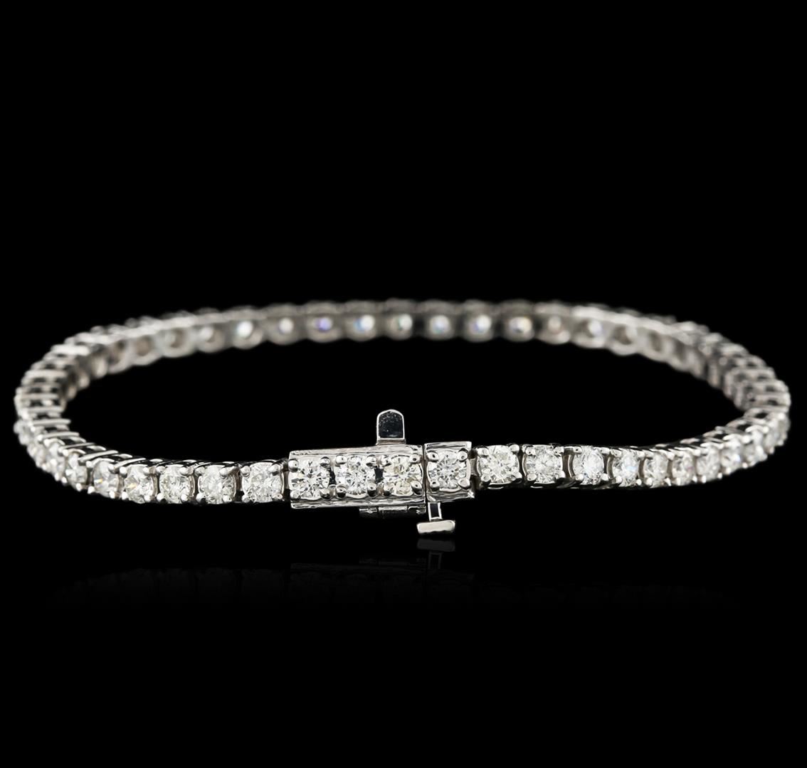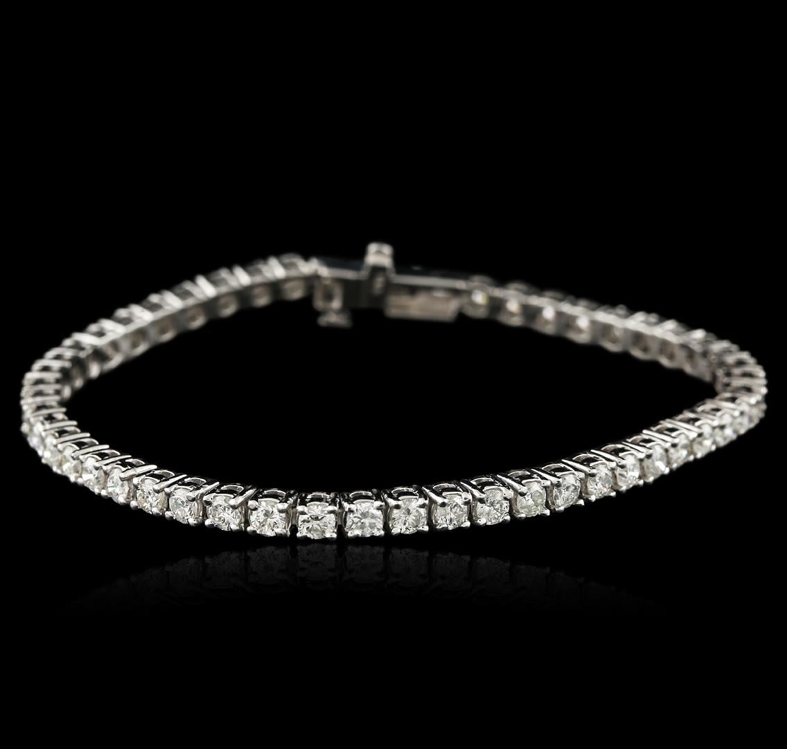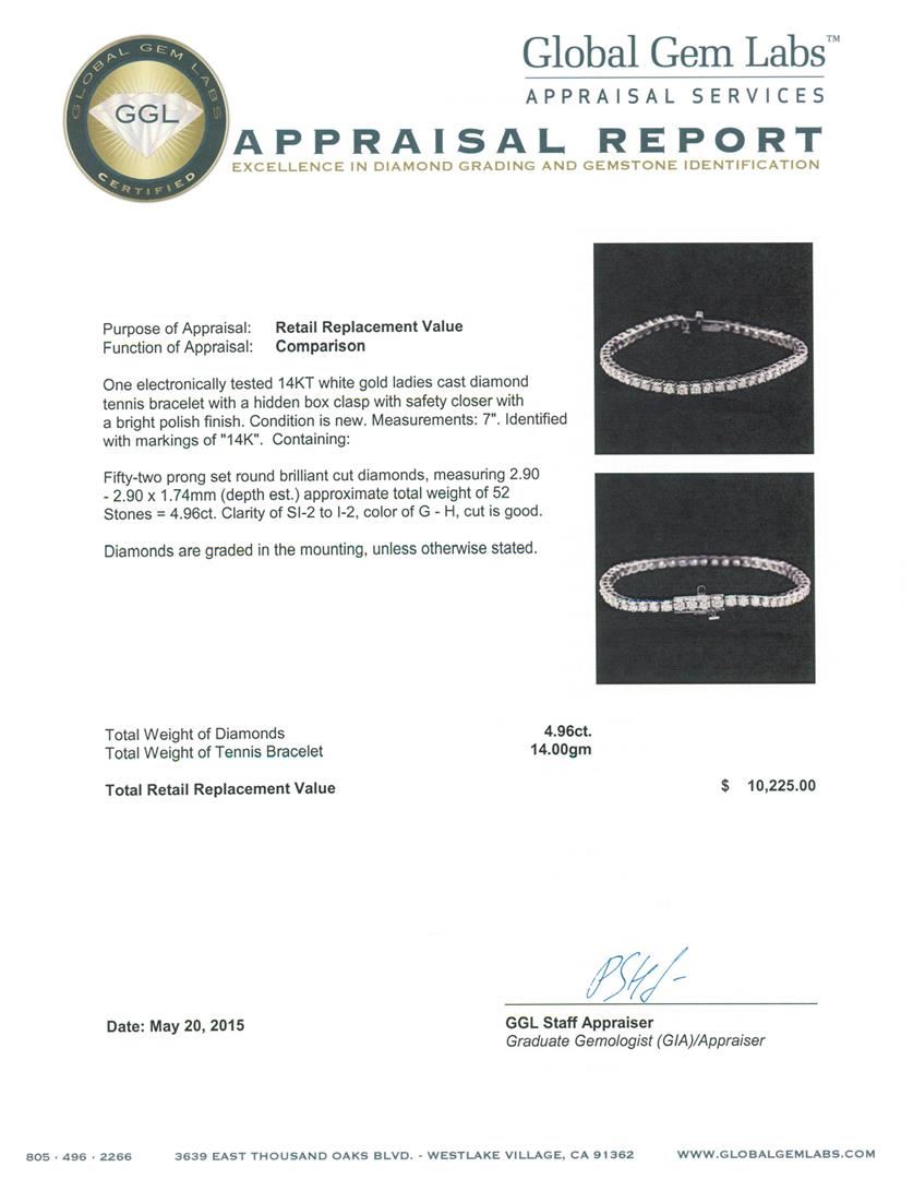 One electronically tested 14KT white gold ladies cast diamond tennis bracelet with a hidden box clasp with safety closer with a bright polish finish. Measurements: 7". Identified with markings of "14K". Condition is new. Containing: Fifty-Two prong set round brilliant cut diamonds, measuring 2.90 - 2.90 x 1.74mm (depth est.) approximate total weight of 52 Stones = 4.96ct. Clarity: SI-2 to I-2. Color: G - H, Cut is Good. Diamonds are graded in the mounting, unless otherwise stated. Total Weight of Diamonds 4.96ct. Total Weight of Tennis Bracelet 14.00 grams. GGL Appraised at $10,225.00.