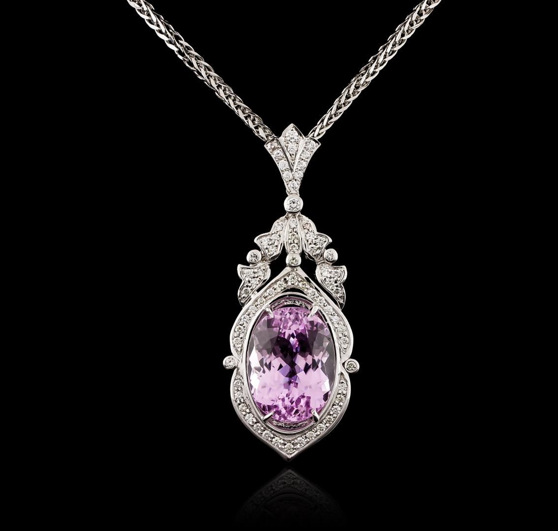 One electronically tested 14KT white gold ladies cast & assembled kunzite and diamond pendant with chain. The pendant features a kunzite set within a stylized diamond frame, completed by a diamond set bail. The pendant is supported by an eighteen inch length 14KT white gold designer style chain, terminating in a lobster claw clasp. Bright polish finish. Identified with markings of "K14". Condition is new, good workmanship. Containing: One prong set oval mixed cut natural kunzite, measuring 22.70 x 17.30 x 14.05mm, 12% bulge factor, approximate weight of 40.03ct., clarity is eye clean, type I, medium light, very slightly grayish, reddish purple color, (GIA rP 4/3), cut is good. Transmitting light with no distortion, transparent. Colored Stone Grading Report attached. Graded in the setting. Sixty-Six prong and bezel set round brilliant cut diamonds, measuring 2.50 - 2.00 x 1.35mm (depth est.) approximate total weight of 66 Stones = 2.84ct. Graded in the setting. Clarity: VS-2 to SI-1. Color: H - J. Total Weight of Colored Stones 40.03ct. Total Weight of Diamonds 2.84ct. Total Weight of Pendant With Chain 30.71 grams. AIG Appraised at $24,095.00.