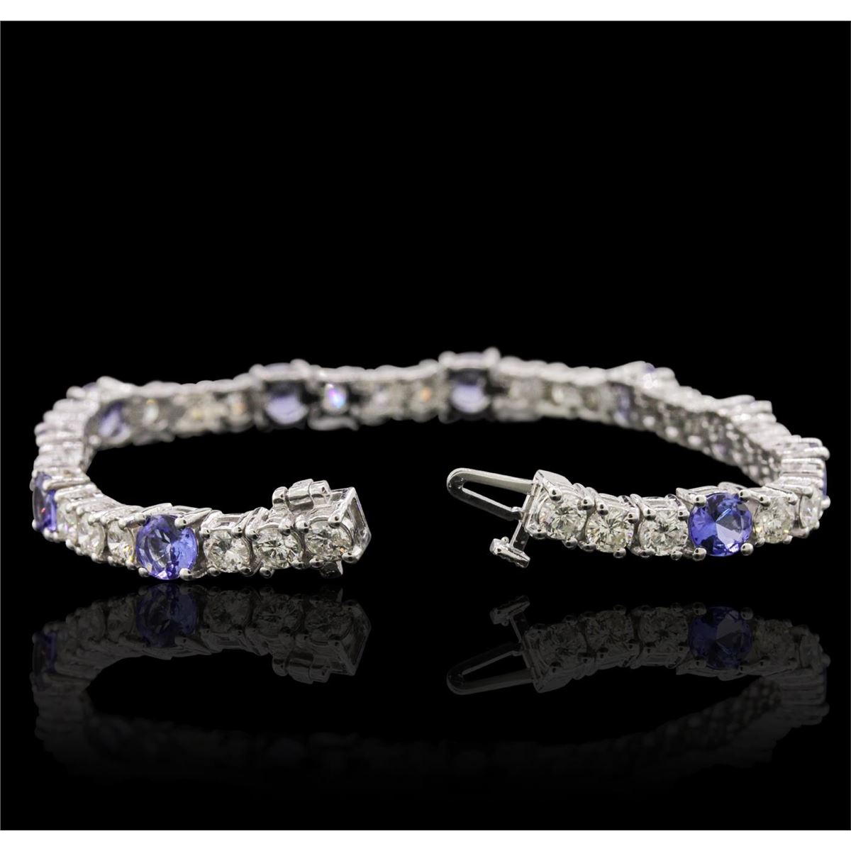 One electronically tested 14KT white gold ladies cast & assembled tanzanite and diamond bracelet with a bright polish finish. Condition is new, good workmanship. Seven and one-quarter inch length bracelet features a flexible tanzanite and diamond ribbon, terminating in a concealed clasp with safety bar. Identified with markings of "14K". Containing: Ten prong set round mixed cut natural tanzanites, measuring 5.10 - 5.00 x 2.80 mm, 6%. bulge factor, approximate. Total Weight of 5.20ct., clarity is eye clean, type I, medium dark, very slightly grayish, bluish violet color, (GIA bV 6/3), cut is good. Transmitting light with no distortion, transparent. Color grade is an average for the group. Graded in the setting. Tanzanite is a very rare gemstone that is only found in the country of Tanzania. Originally discovered in 1967. Tiffany & Company, named the stone Tanzanite. It is found in the Usumburu Mountains that border the Umba Valley of northern Tanzania. Tanzanite occurs in gray, brown, violet, blue, reddish-purple, & green. The gem is interesting because of its exceptional pleochroism. Rotated in different directions a tanzanite will exhibit multiple changes of color. Tanzanite has a low tolerance to ultrasonic cleaning, and should not be cleaned using this method. Thirty-Three prong set round brilliant cut diamonds, measuring 3.30 - 3.20 x 1.95mm (depth est.) approximate. Total Weight of 33 Stones = 4.00ct. Graded in the setting. Clarity: SI-2 to I-1. Color: H - J. Total Weight of Colored Stones 5.20ct. Total Weight of Diamonds 4.00ct. Total Weight of Bracelet 17.36 grams. AIG Appraised at $17,960.00.