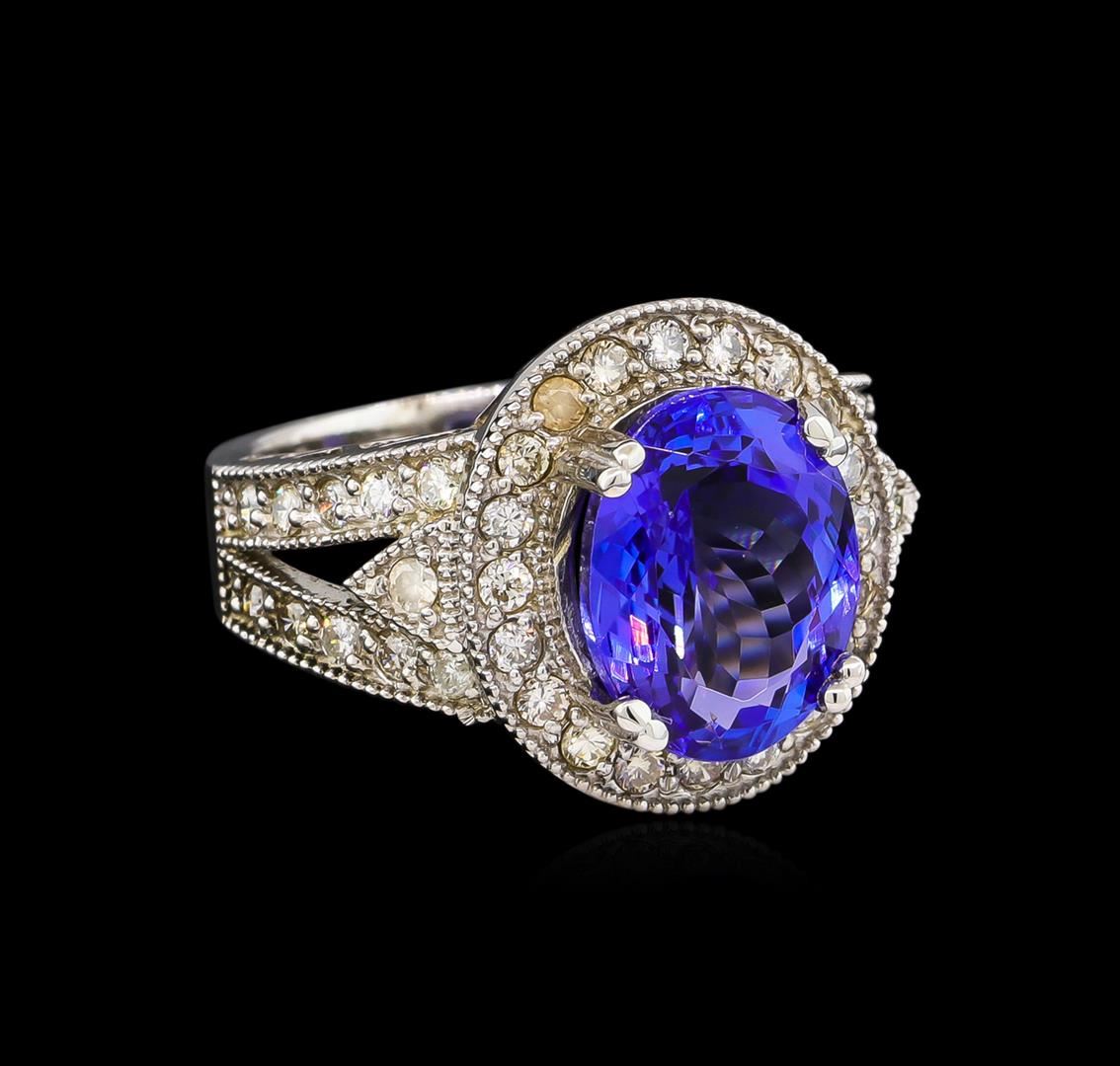 One electronically tested 14KT white gold Ladies combination cast & assembled ring with a bright polish finish. Condition is new. Identified with markings of "K14". Containing: One prong set oval modified brilliant cut natural tanzanite, measuring 12.51 x 9.79 x 6.26mm, approximate weight of 5.21ct., clarity is eye clean, type I, medium, moderately strong, bluish violet color, (GIA bV 5/4), cut is very good. Colored gemstones are presumed to have been subjected to commonly used color/clarity enhancement processes. Forty-Three prong set round brilliant cut diamonds, measuring 1.80 - 1.80 x 1.08mm (depth est.) approximate. Total Weight of 43 Stones = 0.92ct. Clarity: SI-2 to I-1. Color: I - J, Cut is Good. Total Weight of Colored Stones 5.21ct. Total Weight of Diamonds 0.92ct. Total Weight of Ring 9.50 grams. GGL Appraised at $9,545.00.