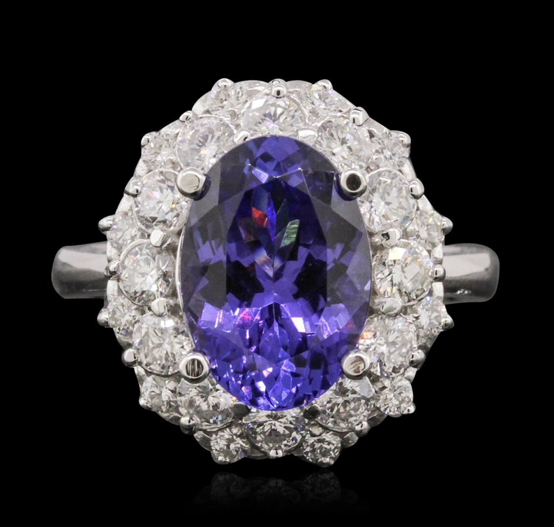 One electronically tested 14KT white gold ladies cast tanzanite and diamond ring with a bright polish finish. Condition is new, good workmanship. The featured tanzanite is set within two tiered diamond bezels, completed by a two and one-half millimeter wide band. Identified with markings of "K14". Containing: One prong set oval brilliant cut natural tanzanite, measuring 12.35 x 8.70 x 6.50mm, 8%. bulge factor, approximate weight of 5.21ct., clarity is eye clean, type I, dark, very slightly grayish, violetish blue color, (GIA vB 7/3), cut is good. Transmitting light with no distortion, transparent. Colored Stone Grading Report attached. Graded in the setting.Tanzanite is a very rare gemstone that is only found in the country of Tanzania. Originally discovered in 1967. Tiffany & Company, named the stone Tanzanite. It is found in the Usumburu Mountains that border the Umba Valley of northern Tanzania. Tanzanite occurs in gray, brown, violet, blue, reddish-purple, & green. The gem is interesting because of its exceptional pleochroism. Rotated in different directions a tanzanite will exhibit multiple changes of color. Tanzanite has a low tolerance to ultrasonic cleaning, and should not be cleaned using this method.Twelve prong set round brilliant cut diamonds, measuring 2.90 - 2.80 x 1.71mm (depth est.) approximate. Total Weight of 12 Stones = 1.11ct. Graded in the setting. Clarity: SI-2 to I-1. Color: G - I Twelve prong set round brilliant cut diamonds, measuring 1.90 - 1.80 x 1.11mm (depth est.) approximate. Total Weight of 12 Stones = 0.37ct. Graded in the setting. Clarity: SI-1 to I-1. Color: G - I. Total Weight of Colored Stones 5.21ct. Total Weight of Diamonds 1.48ct. Total Weight of Ring 7.32gm. AIG Appraised at $18,565.00.