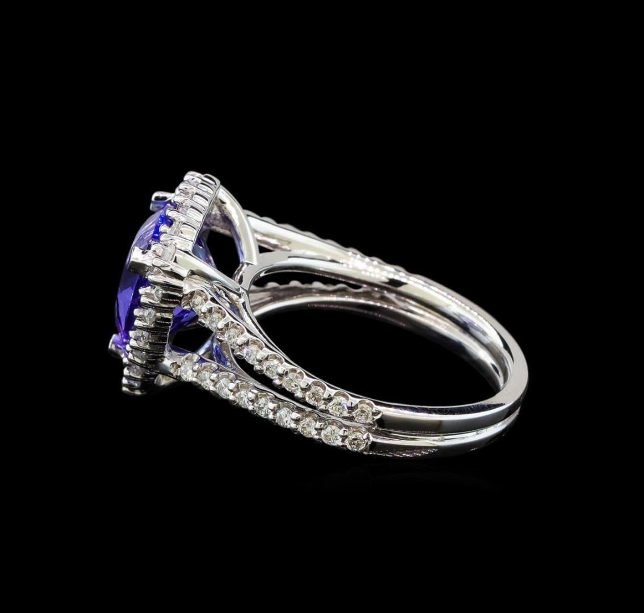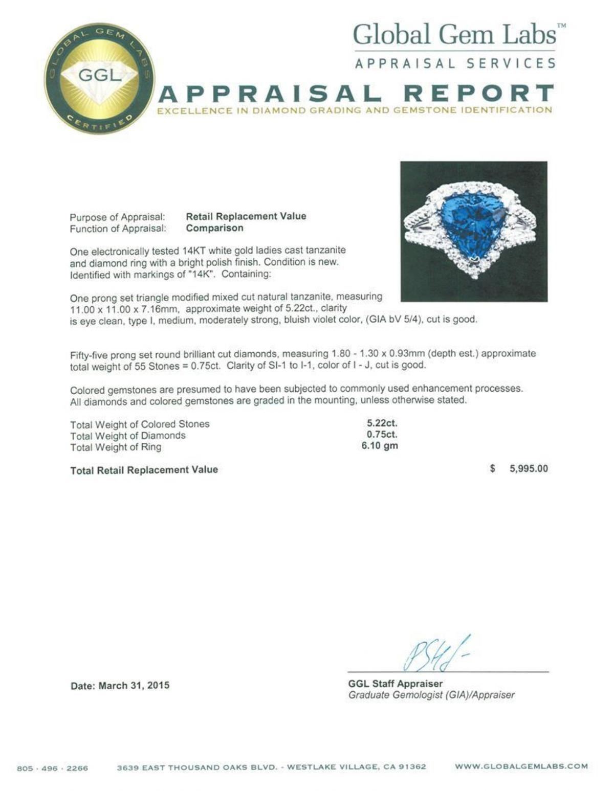 One electronically tested 14KT white gold ladies cast tanzanite and diamond ring with a bright polish finish. Identified with markings of "14K". Condition is new. Containing: One prong set triangle modified mixed cut natural tanzanite, measuring 11.00 x 11.00 x 7.16mm, approximate weight of 5.22ct., clarity is eye clean, type I, medium, moderately strong, bluish violet color, (GIA bV 5/4), cut is good. Fifty-Five prong set round brilliant cut diamonds, measuring 1.80 - 1.30 x 0.93mm (depth est.) approximate total weight of 55 Stones = 0.75ct. Clarity: SI-1 to I-1. Color: I - J, Cut is Good. Colored gemstones are presumed to have been subjected to commonly used enhancement processes. All diamonds and colored gemstones are graded in the mounting, unless otherwise stated. Total Weight of Colored Stones 5.22ct. Total Weight of Diamonds 0.75ct. Total Weight of Ring 6.10 grams. GGL Appraised.