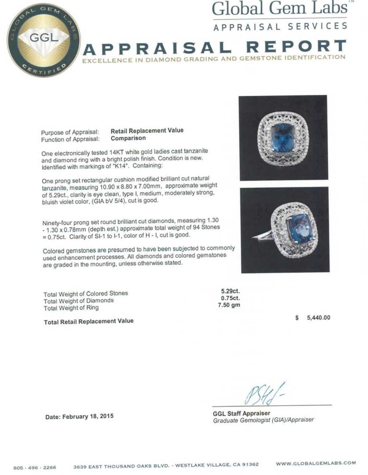 One electronically tested 14KT white gold ladies cast tanzanite and diamond ring with a bright polish finish. Identified with markings of "K14". Condition is new. Containing: One prong set rectangular cushion modified brilliant cut natural tanzanite, measuring 10.90 x 8.80 x 7.00mm, approximate weight of 5.29ct., clarity is eye clean, type I, medium, moderately strong, bluish violet color, (GIA bV 5/4), cut is good. Ninety-Four prong set round brilliant cut diamonds, measuring 1.30 - 1.30 x 0.78mm (depth est.) approximate total weight of 94 Stones = 0.75ct. Clarity: SI-1 to I-1. Color: H - I, Cut is Good. Colored gemstones are presumed to have been subjected to commonly used enhancement processes. All diamonds and colored gemstones are graded in the mounting, unless otherwise stated. Total Weight of Colored Stones 5.29ct. Total Weight of Diamonds 0.75ct. Total Weight of Ring 7.50 grams. GGL Appraised.