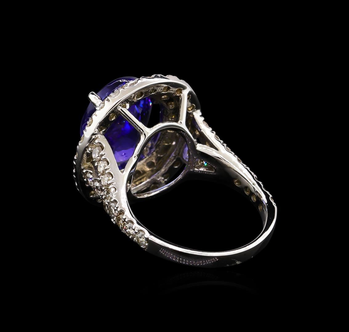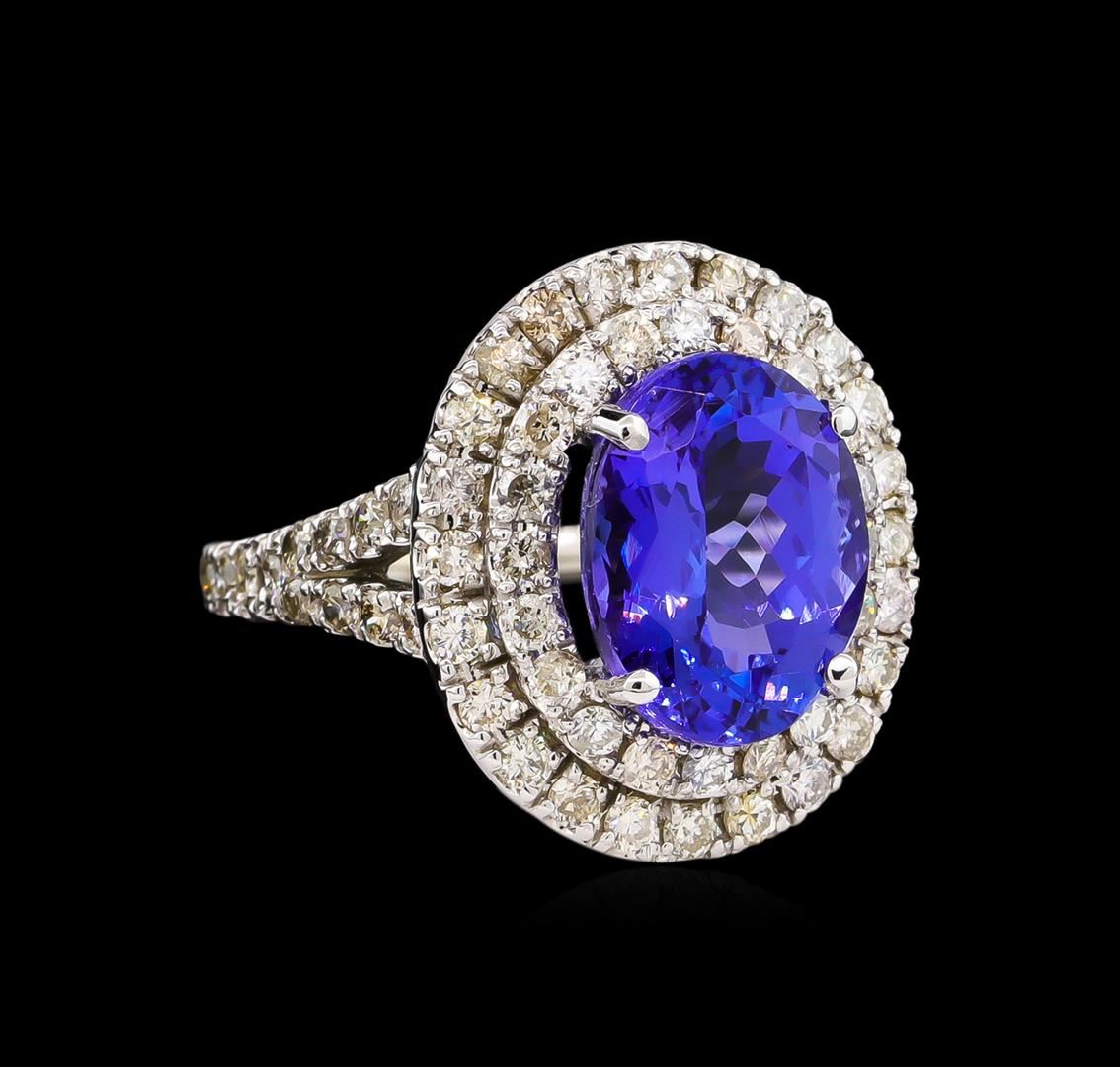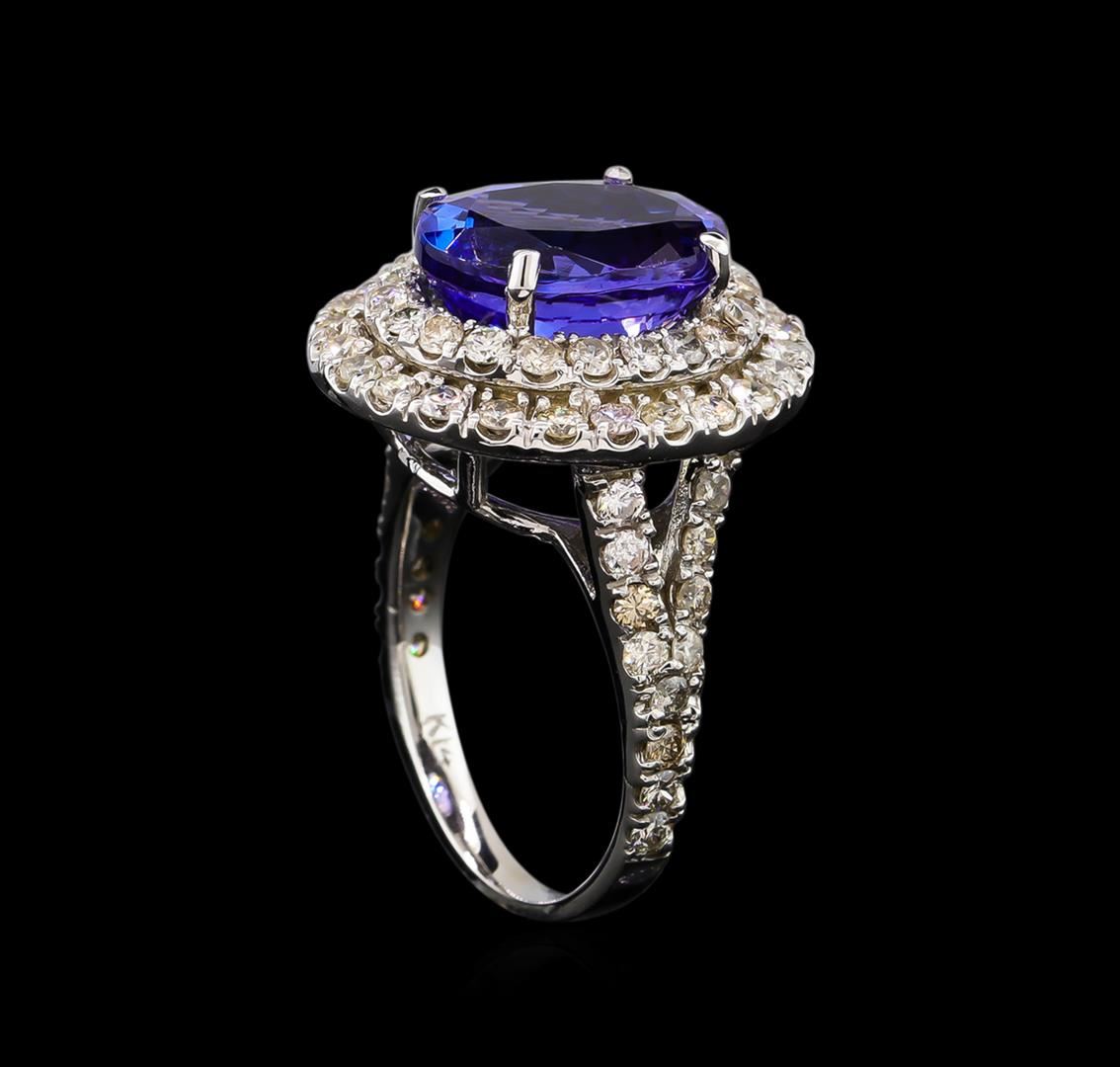 One electronically tested 14KT white gold Ladies combination cast & assembled ring with a bright polish finish. Condition is new. Identified with markings of "K14". Containing: One prong set oval modified brilliant cut natural tanzanite, measuring 12.41 x 9.64 x 6.50mm, approximate weight of 5.29ct., clarity is eye clean, type I, medium, very slightly grayish, bluish violet color, (GIA bV 5/3), cut is good. Colored gemstones are presumed to have been subjected to commonly used color/clarity enhancement processes. Seventy-Two prong set round brilliant cut diamonds, measuring 1.80 - 1.80 x 1.08mm (depth est.) approximate. Total Weight of 72 Stones = 1.53ct. Clarity: I-1 to I-2. Color: K - L, Cut is Good. Total Weight of Colored Stones 5.29ct. Total Weight of Diamonds 1.53ct. Total Weight of Ring 7.70 grams. GGL Appraised.