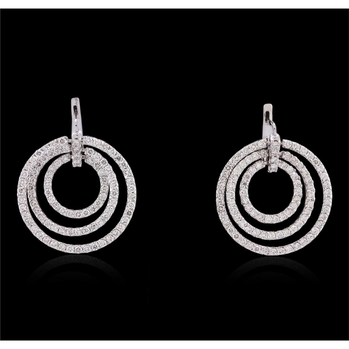 One pair electronically tested 14KT white gold ladies cast diamond earrings with hinged clip backs with a bright polish finish. Identified with markings of "14K". Condition is new. Containing: One Hundred Eighty-Six prong set round brilliant cut diamonds, measuring 2.00 - 2.00 x 1.20mm (depth est.) approximate total weight of 186 Stones = 5.43ct. Clarity: SI-2 to I-1. Color: I - J, Cut is Good. All diamonds are graded in the mounting, unless otherwise stated. Total Weight of Diamonds 5.43ct. Total Weight of Earrings 13.30 grams. GGL Appraised at $9,955.00.
