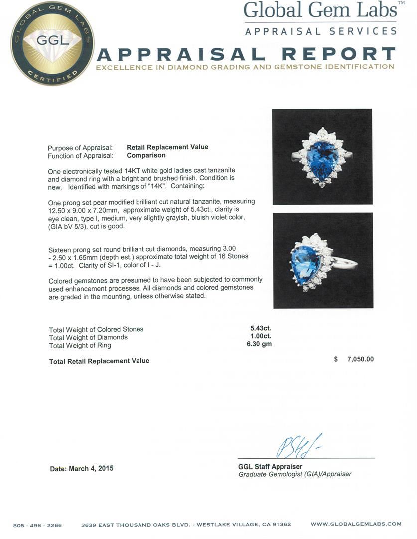 One electronically tested 14KT white gold ladies cast tanzanite and diamond ring with a bright and brushed finish. Identified with markings of "14K". Condition is new. Containing: One prong set pear modified brilliant cut natural tanzanite, measuring 12.50 x 9.00. x 7.20mm, approximate weight of 5.43ct., clarity is eye clean, type I, medium, very slightly grayish, bluish violet color, (GIA bV 5/3), cut is good. Sixteen prong set round brilliant cut diamonds, measuring 3.00. - 2.50 x 1.65mm (depth est.) approximate total weight of 16 Stones = 1.00.ct. Clarity: SI-1. Color: I - J. Colored gemstones are presumed to have been subjected to commonly used enhancement processes. All diamonds and colored gemstones are graded in the mounting, unless otherwise stated. Total Weight of Colored Stones 5.43ct. Total Weight of Diamonds 1.00.ct. Total Weight of Ring 6.30 grams. GGL Appraised.