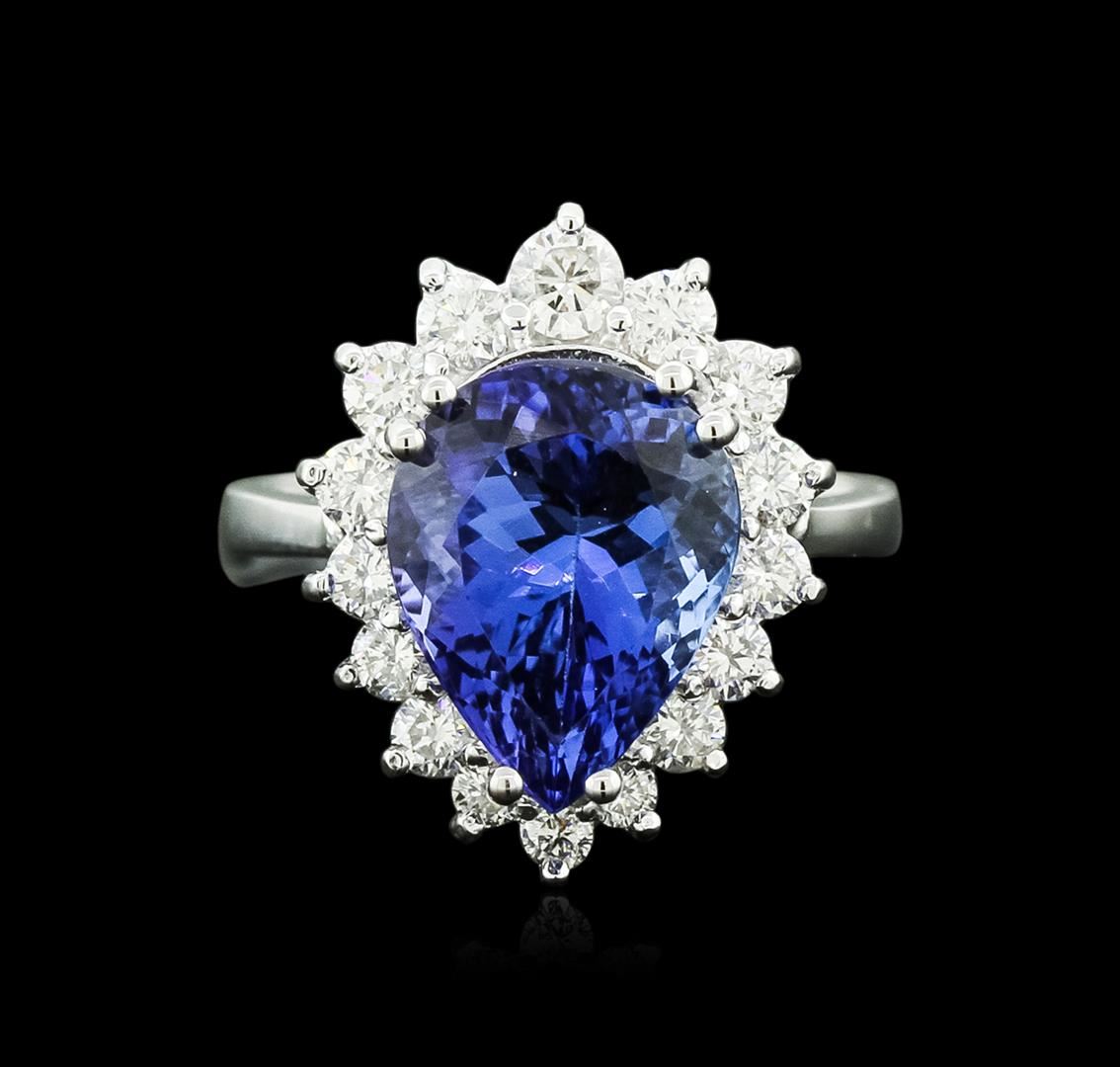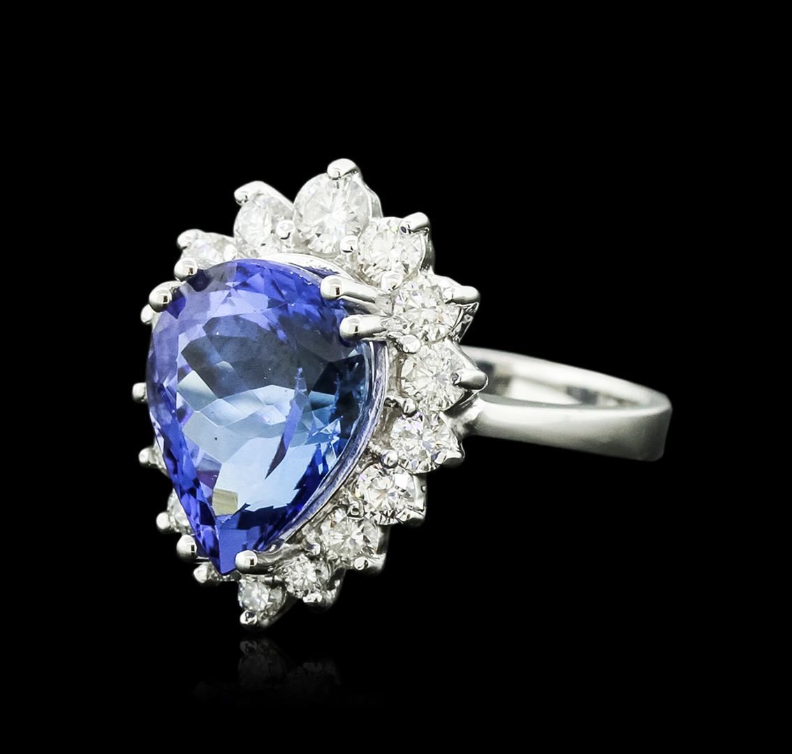One electronically tested 14KT white gold ladies cast tanzanite and diamond ring with a bright and brushed finish. Identified with markings of "14K". Condition is new. Containing: One prong set pear modified brilliant cut natural tanzanite, measuring 12.50 x 9.00. x 7.20mm, approximate weight of 5.43ct., clarity is eye clean, type I, medium, very slightly grayish, bluish violet color, (GIA bV 5/3), cut is good. Sixteen prong set round brilliant cut diamonds, measuring 3.00. - 2.50 x 1.65mm (depth est.) approximate total weight of 16 Stones = 1.00.ct. Clarity: SI-1. Color: I - J. Colored gemstones are presumed to have been subjected to commonly used enhancement processes. All diamonds and colored gemstones are graded in the mounting, unless otherwise stated. Total Weight of Colored Stones 5.43ct. Total Weight of Diamonds 1.00.ct. Total Weight of Ring 6.30 grams. GGL Appraised.