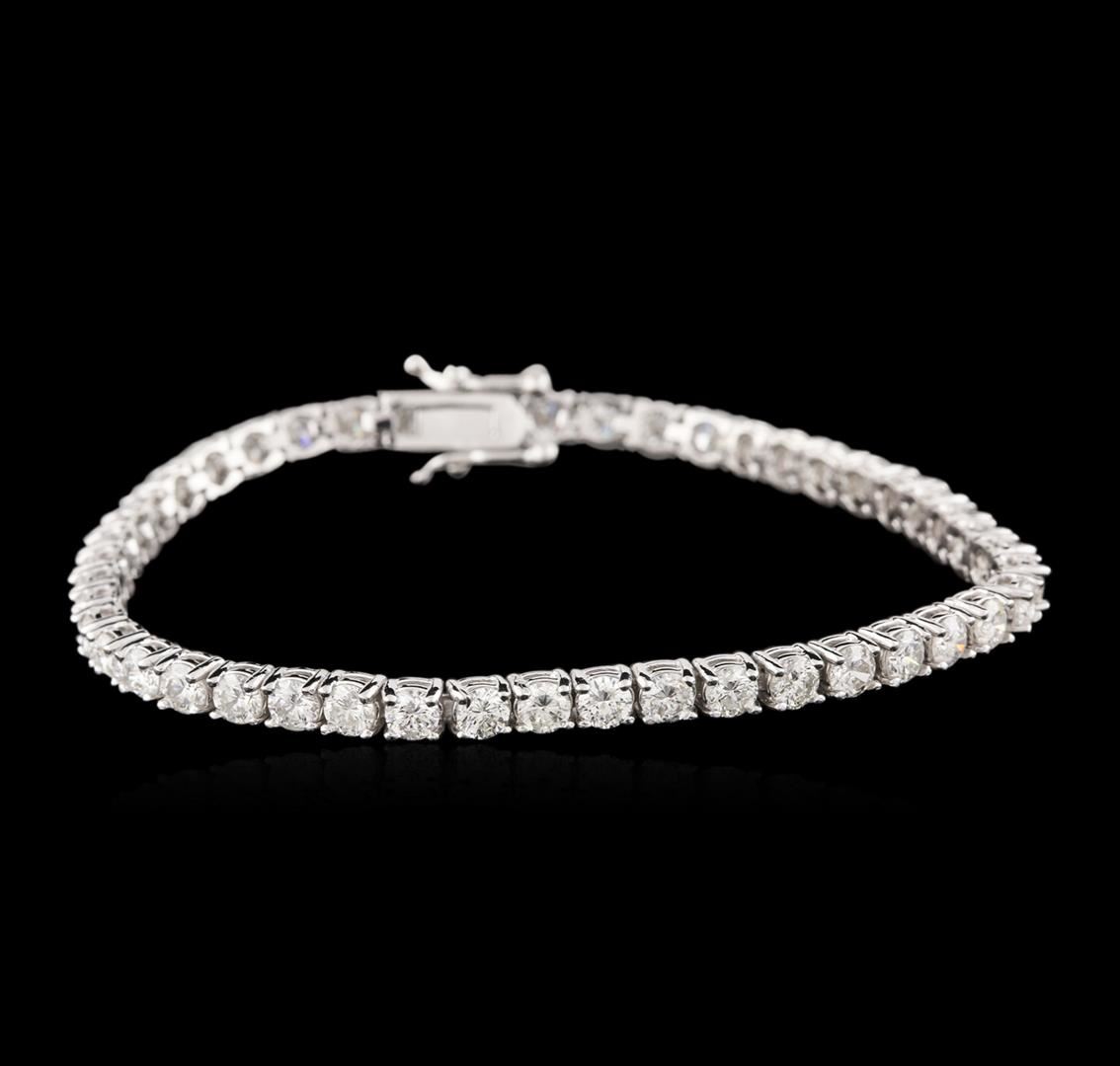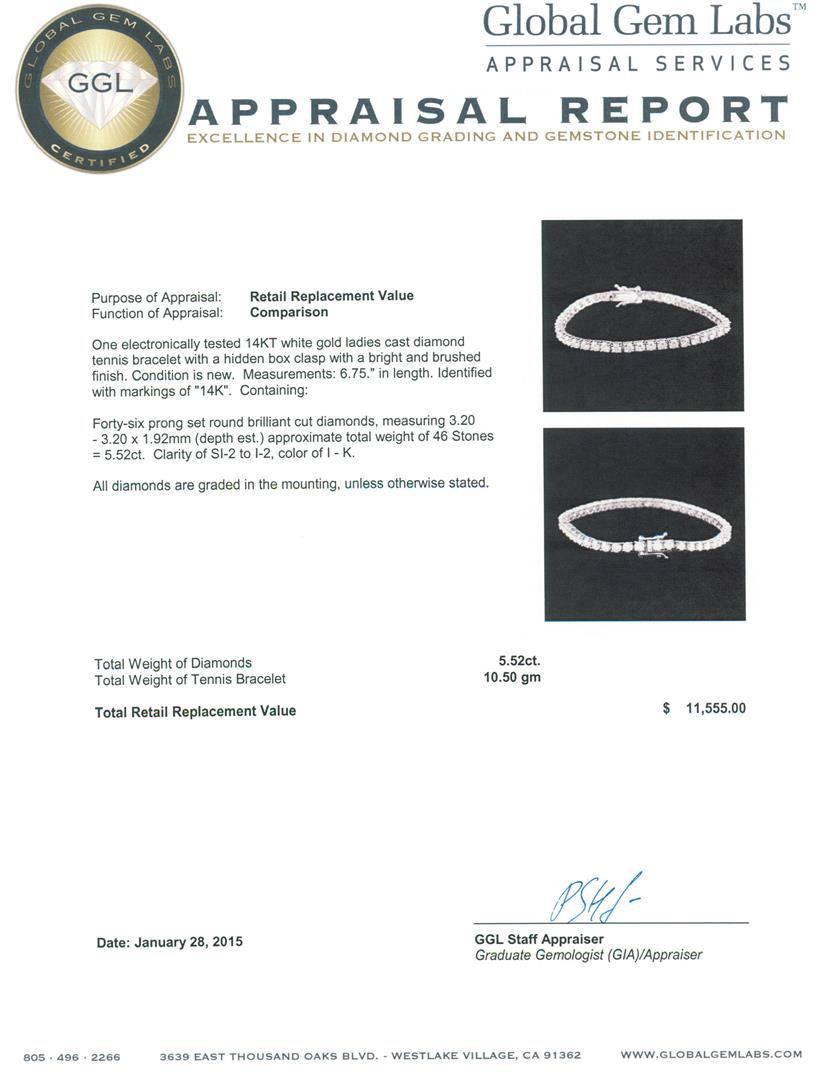 One electronically tested 14KT white gold ladies cast diamond tennis bracelet with a hidden box clasp with a bright and brushed finish. Measurements: 6.75." in length. Identified with markings of "14K". Condition is new. Containing: Forty-Six prong set round brilliant cut diamonds, measuring 3.20 - 3.20 x 1.92mm (depth est.) approximate total weight of 46 Stones = 5.52ct. Clarity: SI-2 to I-2. Color: I - K. All diamonds are graded in the mounting, unless otherwise stated. Total Weight of Diamonds 5.52ct. Total Weight of Tennis Bracelet 10.50 grams. GGL Appraised at $11,555.00.