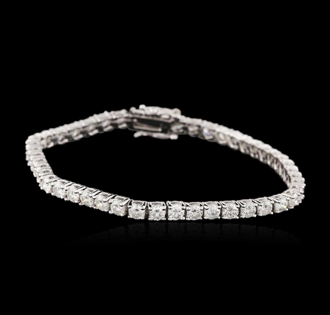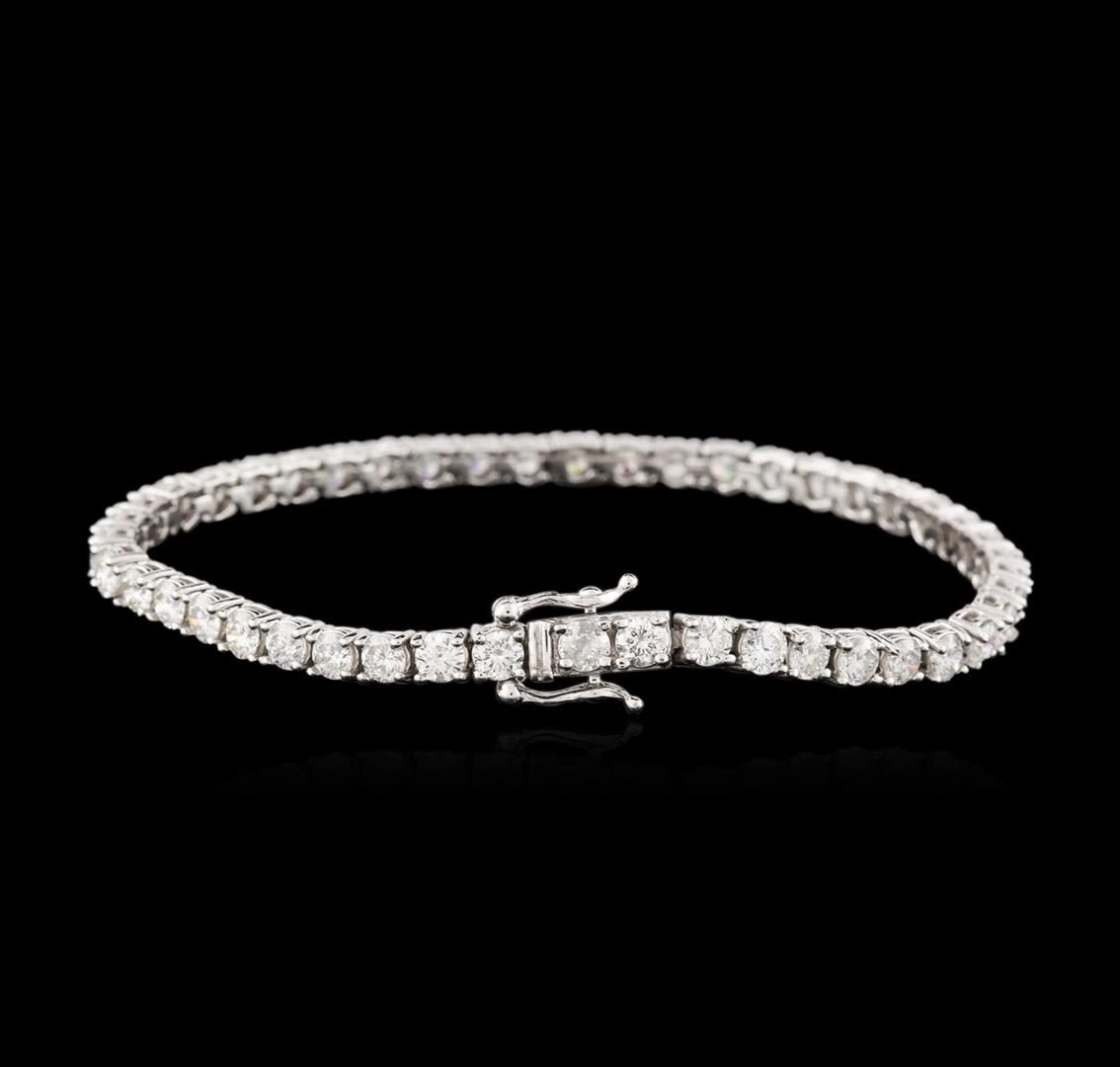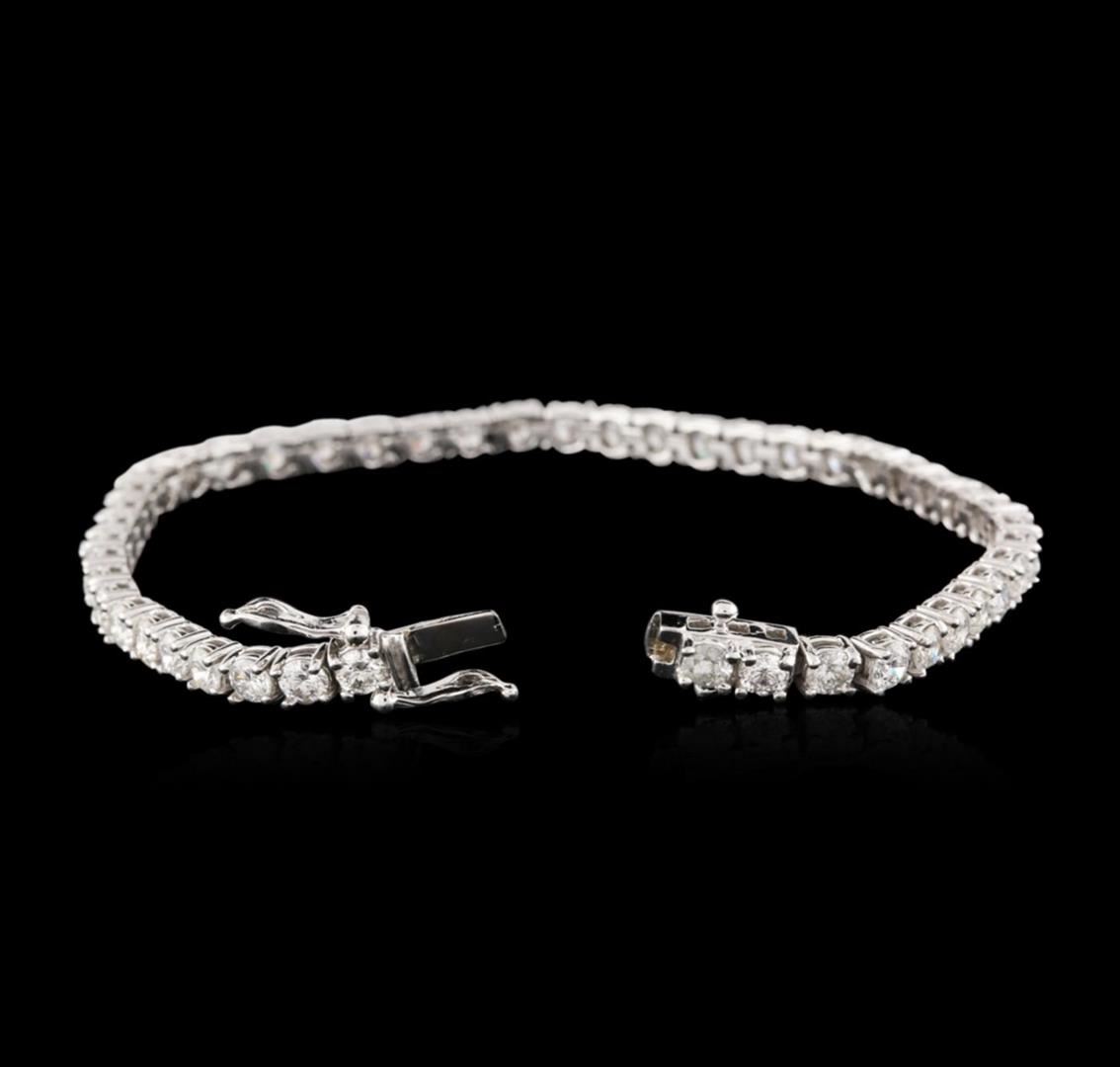 One electronically tested 14KT white gold ladies cast diamond tennis bracelet with a hidden box clasp with a bright and brushed finish. Measurements: 6.75." in length. Identified with markings of "14K". Condition is new. Containing: Forty-Six prong set round brilliant cut diamonds, measuring 3.20 - 3.20 x 1.92mm (depth est.) approximate total weight of 46 Stones = 5.52ct. Clarity: SI-2 to I-2. Color: I - K. All diamonds are graded in the mounting, unless otherwise stated. Total Weight of Diamonds 5.52ct. Total Weight of Tennis Bracelet 10.80 grams. GGL Appraised.