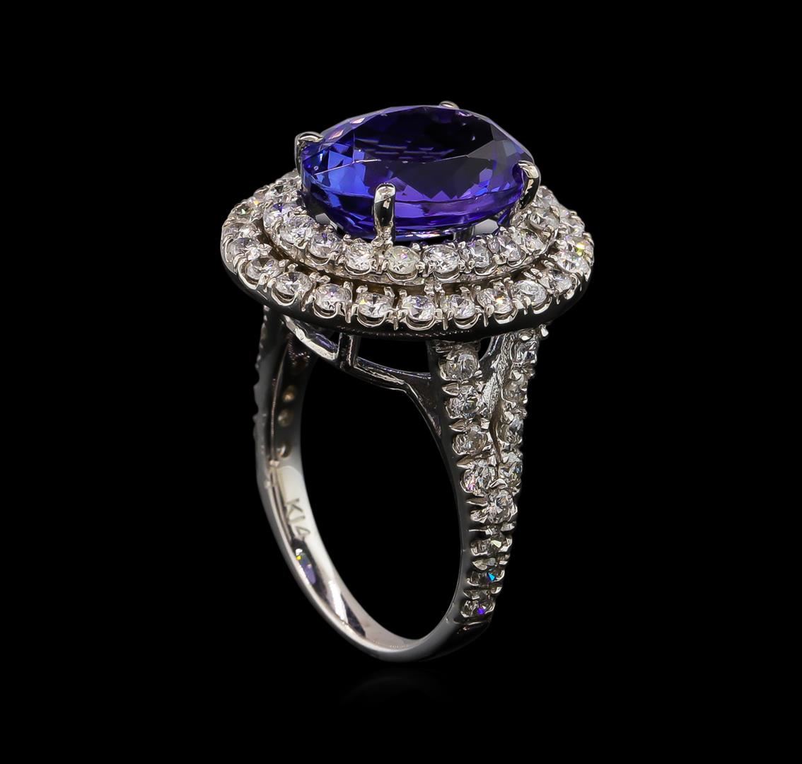 One electronically tested 14KT white gold Ladies combination cast & assembled ring with a bright polish finish. Condition is new. Identified with markings of "14K". Containing: One prong set oval modified brilliant cut natural tanzanite, measuring 12.60 x 10.00 x 6.50mm, approximate weight of 5.56ct., clarity is eye clean, type I, medium, moderately strong, bluish violet color, (GIA bV 5/4), cut is good. Colored gemstones are presumed to have been subjected to commonly used color/clarity enhancement processes. Sixty-Eight prong set round brilliant cut diamonds, measuring 1.70 - 1.70 x 1.02mm (depth est.) approximate. Total Weight of 68 Stones = 1.22ct. Clarity: I-1 to I-2. Color: I - J, Cut is Good. Total Weight of Colored Stones 5.56ct. Total Weight of Diamonds 1.22ct. Total Weight of Ring 8.00 grams. GGL Appraised at $11,815.00.