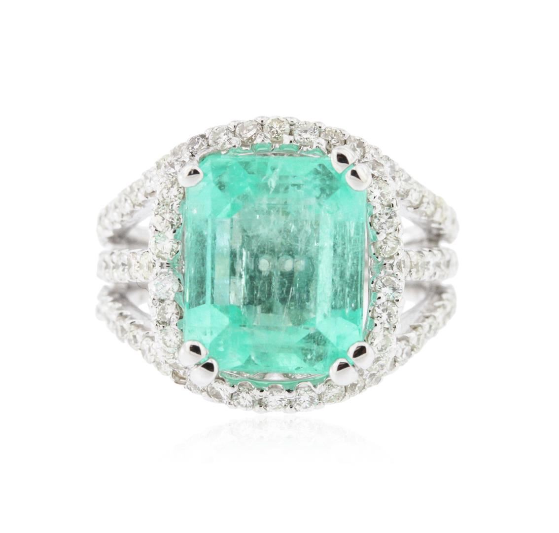 New Condition! MK9714NG. One electronically tested 14KT white gold ladies cast emerald and diamond ring with a bright polish finish. Condition is new, good workmanship. The featured emerald I set within diamond bezel, supported by split shoulders and completed by a three and one-half millimeter wide band. Identified with markings of "K14". Containing: One prong set rectangular step cut natural emerald, measuring 11.25 x 9.30 x 6.05mm, 65 bulge factor, approximate weight of 5.58ct., clarity is moderately included, type III, medium light, very slightly grayish, very slightly bluish green color, (GIA vslbG 4/3), cut is good. Transmitting light with a minimum of distortion, transparent. Naturally occurring internal & external characteristics are present. Indications of oil, & opticon residue. Colored stone grading report attached. Graded in the setting. Ninety-six prong set round brilliant cut diamonds, measuring 1.50 - 1.50 x 0.90mm (depth est.) approximate total weight of 96 stones = 1.28ct. Graded in the setting. Clarity SI-2 to I-2. Color I-J. Total weight of emerald 5.58ct. Total weight of diamonds 1.28ct. Total weight of Ring 8.70gm. AIG appraised at $10,800.00. Thank you for viewing this lot! We are always adding new inventory and new auctions, so please check back often. We appreciate your business and support. Enjoy the auction! SAA - Seized Assets Auctioneers. AIG Appraised at $10,800.00.