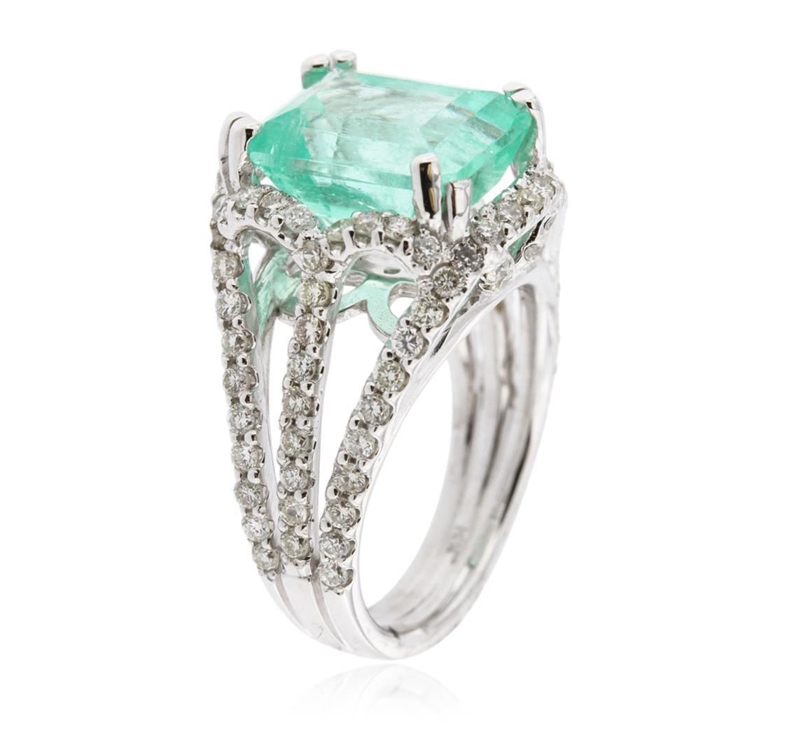 New Condition! MK9714NG. One electronically tested 14KT white gold ladies cast emerald and diamond ring with a bright polish finish. Condition is new, good workmanship. The featured emerald I set within diamond bezel, supported by split shoulders and completed by a three and one-half millimeter wide band. Identified with markings of "K14". Containing: One prong set rectangular step cut natural emerald, measuring 11.25 x 9.30 x 6.05mm, 65 bulge factor, approximate weight of 5.58ct., clarity is moderately included, type III, medium light, very slightly grayish, very slightly bluish green color, (GIA vslbG 4/3), cut is good. Transmitting light with a minimum of distortion, transparent. Naturally occurring internal & external characteristics are present. Indications of oil, & opticon residue. Colored stone grading report attached. Graded in the setting. Ninety-six prong set round brilliant cut diamonds, measuring 1.50 - 1.50 x 0.90mm (depth est.) approximate total weight of 96 stones = 1.28ct. Graded in the setting. Clarity SI-2 to I-2. Color I-J. Total weight of emerald 5.58ct. Total weight of diamonds 1.28ct. Total weight of Ring 8.70gm. AIG appraised at $10,800.00. Thank you for viewing this lot! We are always adding new inventory and new auctions, so please check back often. We appreciate your business and support. Enjoy the auction! SAA - Seized Assets Auctioneers. AIG Appraised.
