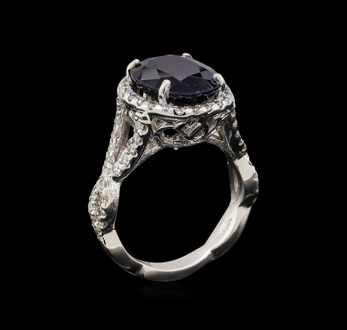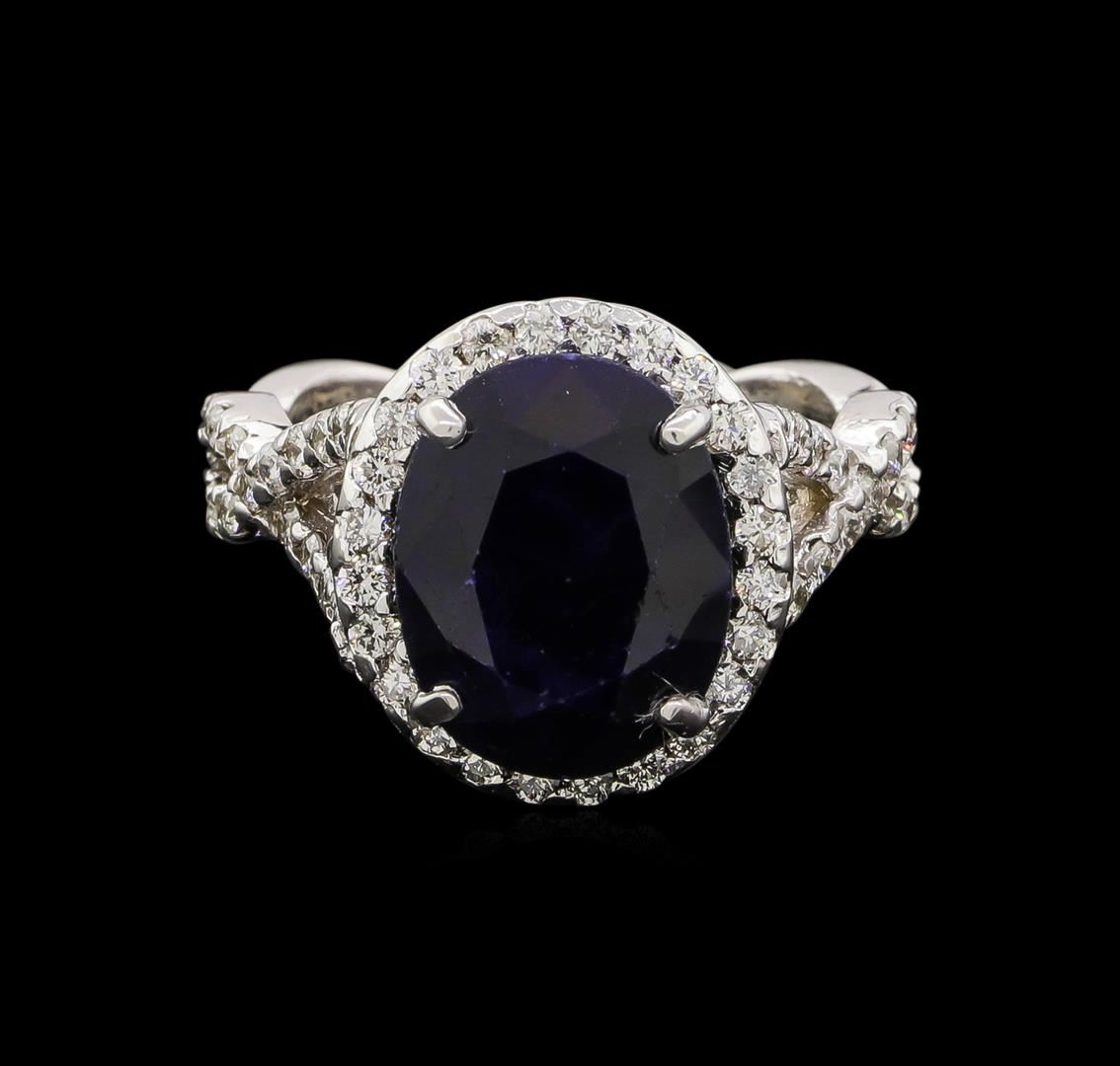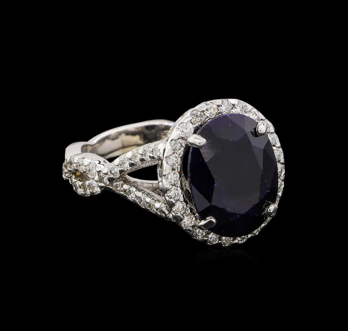 One electronically tested 14KT white gold ladies cast sapphire and diamond ring with a bright polish finish. Identified with markings of "14K". Condition is new. Containing: One prong set oval modified brilliant cut natural blue sapphire, measuring 12.47 x 9.75 x 5.50mm, approximate weight of 5.62ct., clarity is heavily included, type II, dark, strong, blue color, (GIA B 7/5), cut is good. Sixty-Two prong set round brilliant cut diamonds, measuring 1.50 - 1.40 x 0.87mm (depth est.) approximate total weight of 62 Stones = 0.69ct. Clarity: SI-2 to I-1. Color: I - J, Cut is Good. Colored gemstones are presumed to have been subjected to commonly used enhancement processes. All diamonds and colored gemstones are graded in the mounting, unless otherwise stated. Total Weight of Colored Stones 5.62ct. Total Weight of Diamonds 0.69ct. Total Weight of Ring 7.40 grams. GGL Appraised.