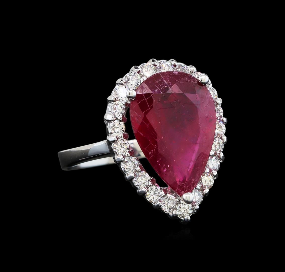 One electronically tested 14KT white gold ladies cast ruby and diamond ring with a bright polish finish. Identified with markings of "14K". Condition is new. Containing: One prong set pear modified brilliant cut natural ruby, measuring 15.00. x 10.00. x 4.90mm, approximate weight of 5.88ct., clarity is heavily included, type II, medium dark, moderately strong, strongly purplish red color, (GIA stpR 6/4), cut is good. Twenty-One prong set round brilliant cut diamonds, measuring 1.90 - 1.90 x 1.14mm (depth est.) approximate total weight of 21 Stones = 0.53ct. Clarity: SI-1 to SI-2. Color: I - J. All diamonds and colored gemstones are graded in the mounting, unless otherwise stated. Colored gemstones are presumed to have been subjected to commonly used enhancement processes. Total Weight of Colored Stones 5.88ct. Total Weight of Diamonds 0.53ct. Total Weight of Ring 6.80 grams. GGL Appraised.