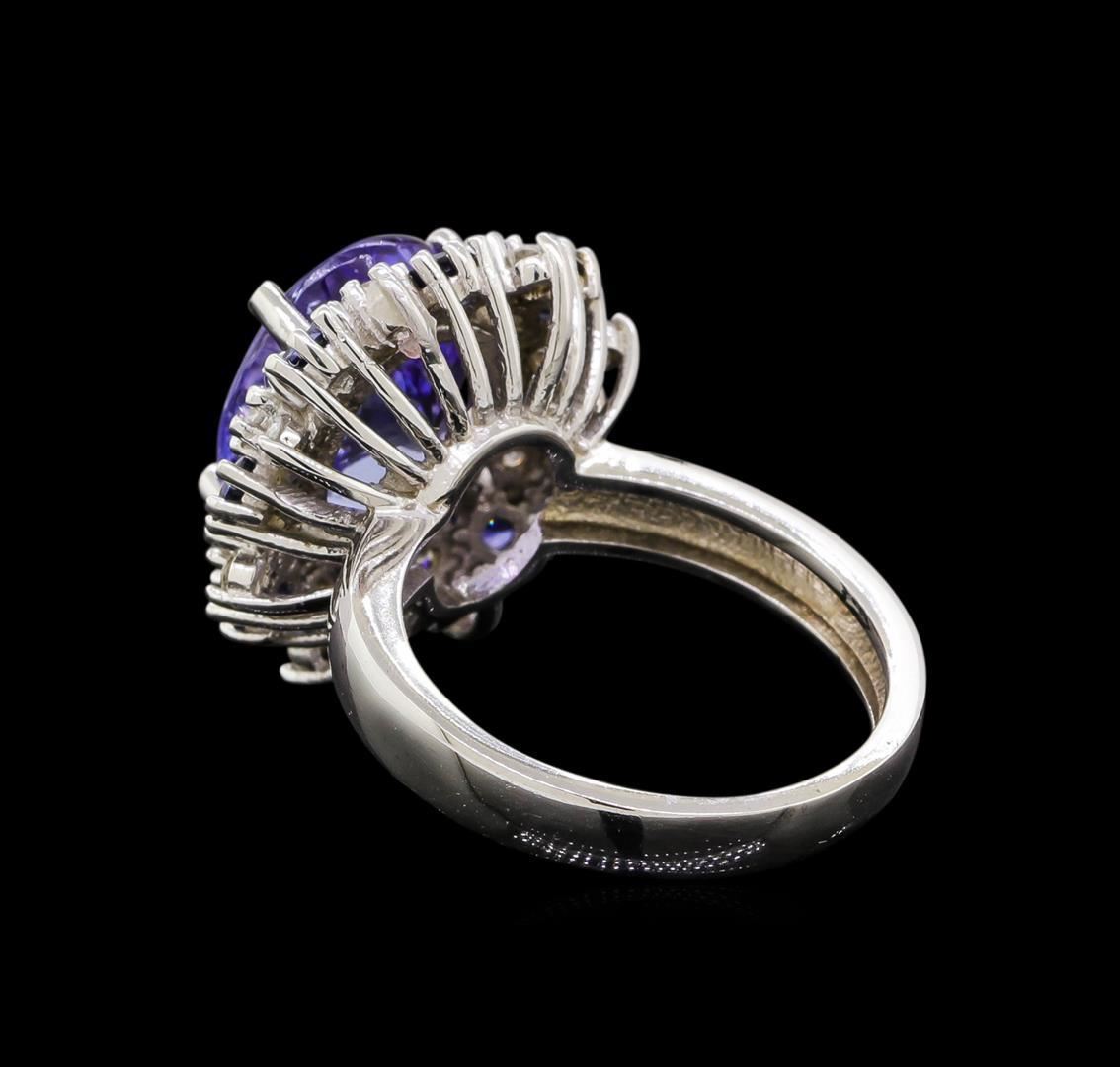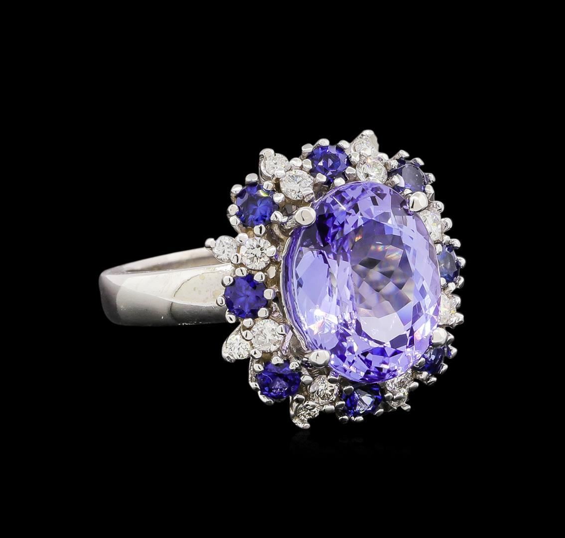 One electronically tested 14KT white gold ladies cast tanzanite, sapphire and diamond ring with a bright polish finish. Identified with markings of "14K". Condition is new. Containing: One prong set oval modified brilliant cut natural tanzanite, measuring 12.60 x 10.10 x 6.57mm, approximate weight of 5.88ct., clarity is eye clean, type I, medium light, slightly grayish, violet color, (GIA V 4/2), cut is good. Eight prong set round modified brilliant cut natural blue sapphires, measuring 2.60 - 2.60 x 1.69 mm, approximate total weight of 0.72ct., clarity is slightly included, type II, medium, moderately strong, blue color, (GIA B 5/4), cut is good. Sixteen prong set round brilliant cut diamonds, measuring 1.90 - 1.50 x 1.02mm (depth est.) approximate total weight of 16 Stones = 0.29ct. Clarity: SI-1 to I-1. Color: I - J, Cut is Good. Colored gemstones are presumed to have been subjected to commonly used enhancement processes. All diamonds and colored gemstones are graded in the mounting, unless otherwise stated. Total Weight of Colored Stones 6.60ct. Total Weight of Diamonds 0.29ct. Total Weight of Ring 8.10 grams. GGL Appraised.