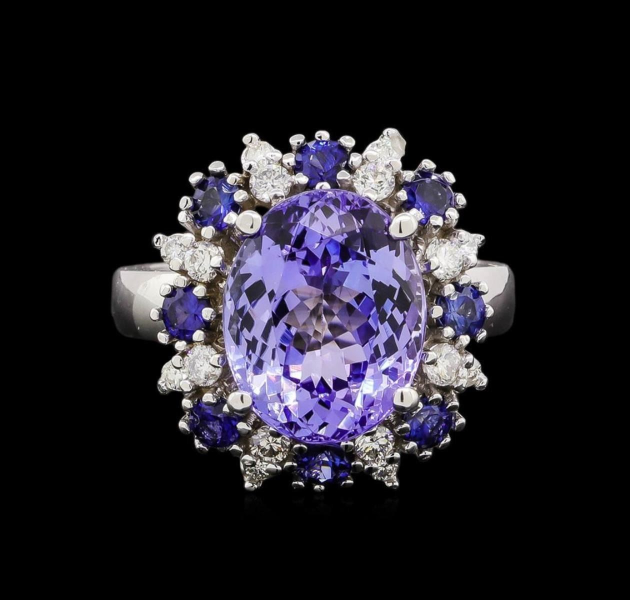 One electronically tested 14KT white gold ladies cast tanzanite, sapphire and diamond ring with a bright polish finish. Identified with markings of "14K". Condition is new. Containing: One prong set oval modified brilliant cut natural tanzanite, measuring 12.60 x 10.10 x 6.57mm, approximate weight of 5.88ct., clarity is eye clean, type I, medium light, slightly grayish, violet color, (GIA V 4/2), cut is good. Eight prong set round modified brilliant cut natural blue sapphires, measuring 2.60 - 2.60 x 1.69 mm, approximate total weight of 0.72ct., clarity is slightly included, type II, medium, moderately strong, blue color, (GIA B 5/4), cut is good. Sixteen prong set round brilliant cut diamonds, measuring 1.90 - 1.50 x 1.02mm (depth est.) approximate total weight of 16 Stones = 0.29ct. Clarity: SI-1 to I-1. Color: I - J, Cut is Good. Colored gemstones are presumed to have been subjected to commonly used enhancement processes. All diamonds and colored gemstones are graded in the mounting, unless otherwise stated. Total Weight of Colored Stones 6.60ct. Total Weight of Diamonds 0.29ct. Total Weight of Ring 8.10 grams. GGL Appraised.