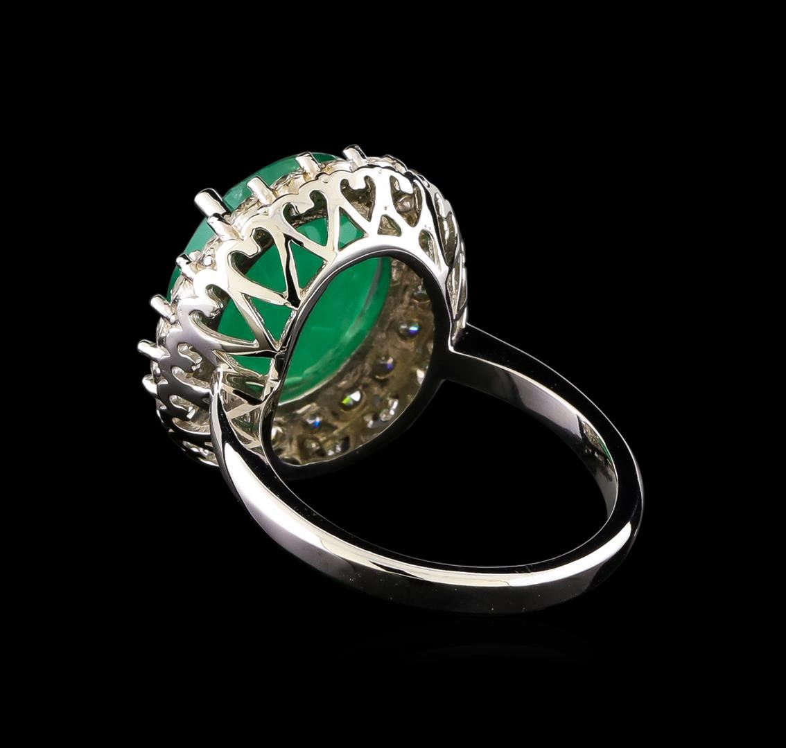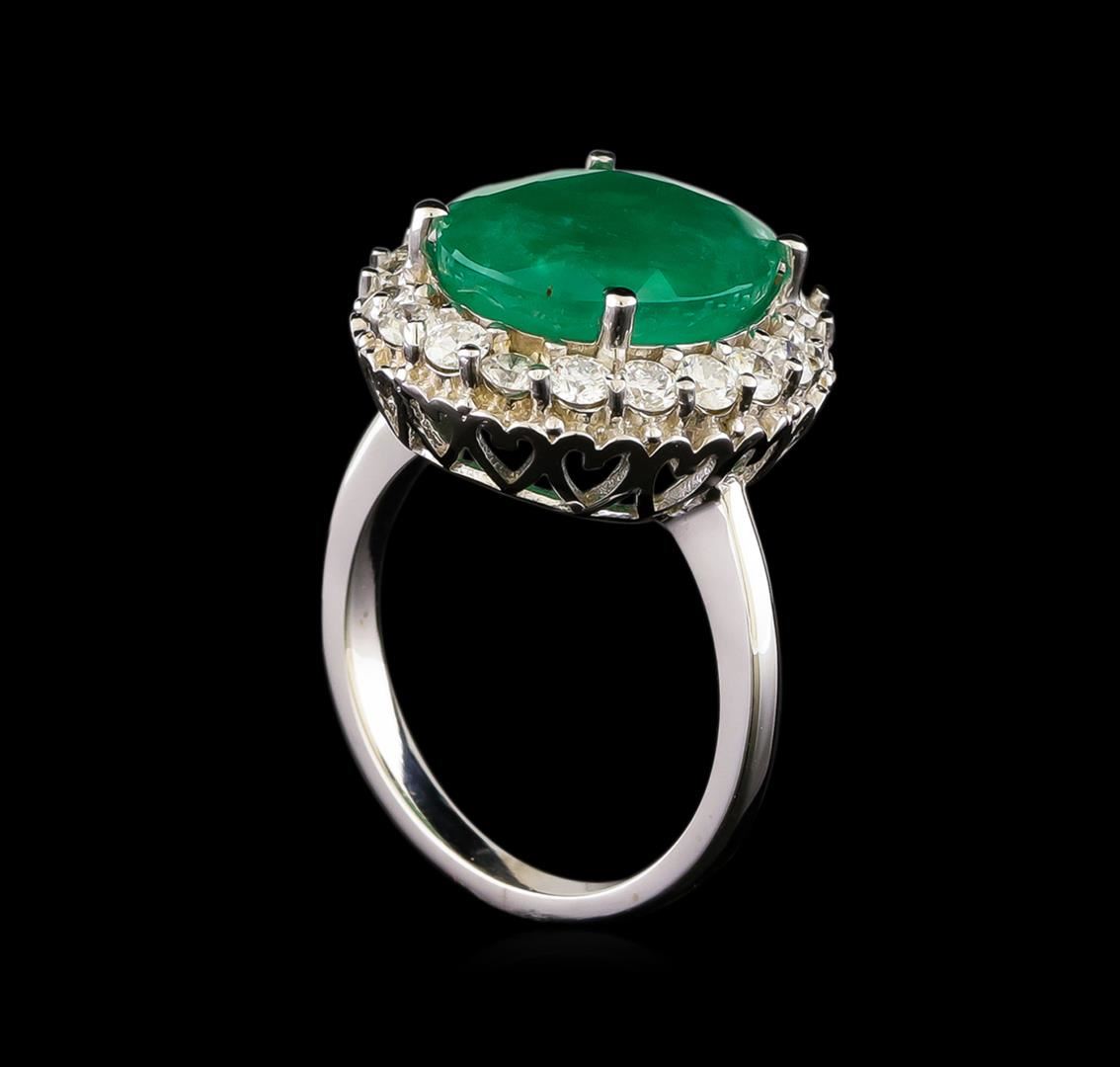 One electronically tested 14KT white gold ladies combination cast & assembled emerald and diamond ring with a flat shank with a bright polish finish. Identified with markings of "14K". Condition is new. Containing: One prong set oval modified brilliant cut natural emerald, measuring 14.35 x 11.69 x 6.21mm, approximate weight of 5.95ct., clarity is heavily included, type III, medium light, very slightly grayish, green color, (GIA G 4/3), cut is good. Twenty prong set round brilliant cut diamonds, measuring 2.20 - 2.20 x 1.32mm (depth est.) approximate total weight of 20 Stones = 0.78ct. Clarity: I-1. Color: I - J, Cut is Good. All diamonds and colored gemstones are graded in the mounting, unless otherwise stated. Colored gemstones are presumed to have been subjected to commonly used enhancement processes. Total Weight of Colored Stones 5.95ct. Total Weight of Diamonds 0.78ct. Total Weight of Ring 7.30 grams. GGL Appraised.