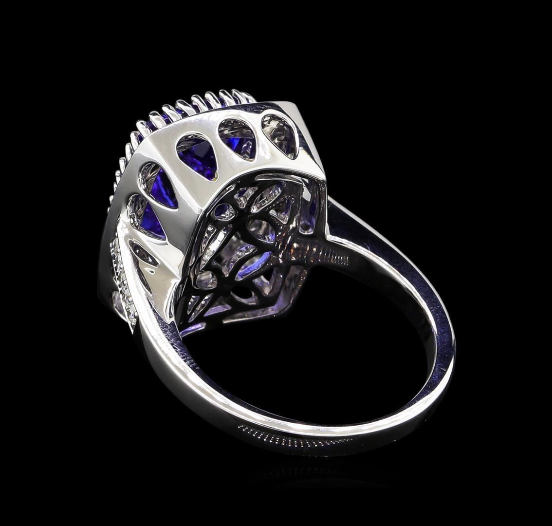 One electronically tested 14KT white gold Ladies combination cast & assembled ring with a bright polish finish. Condition is new. Identified with markings of "14K". Containing: One prong set rectangular cushion modified brilliant cut natural tanzanite, measuring 14.00 x 10.00 x 5.40mm, approximate weight of 5.95ct., clarity is eye clean, type I, medium dark, moderately strong, bluish violet color, (GIA bV 6/4), cut is very good. Colored gemstones are presumed to have been subjected to commonly used color/clarity enhancement processes. Forty-Two prong set round brilliant cut diamonds, measuring 1.50 - 1.50 x 0.90mm (depth est.) approximate. Total Weight of 42 Stones = 0.52ct. Clarity: SI-2 to I-1. Color: G - H, Cut is Good. Total Weight of Colored Stones 5.95ct. Total Weight of Diamonds 0.52ct. Total Weight of Ring 8.20 grams. GGL Appraised.