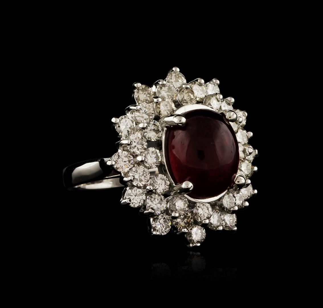 One electronically tested 14KT white gold ladies cast ruby and diamond ring with a bright polish finish. Identified with markings of "14K". Condition is new. Containing: One prong set oval cabochon cut natural ruby, measuring 11.40 x 9.40 x 5.23mm, approximate weight of 6.05ct., clarity is heavily included, type II, medium dark, moderately strong, strongly purplish red color, (GIA stpR 6/4), cut is good. Thirty-Six prong set round brilliant cut diamonds, measuring 2.60 - 2.50 x 1.53mm (depth est.) approximate total weight of 36 Stones = 2.18ct. Clarity: SI-1 to SI-2. Color: J - K, Cut is Good. Colored gemstones are presumed to have been subjected to commonly used enhancement processes, All diamonds and colored gemstones are graded in the mounting, unless otherwise stated. Total Weight of Colored Stones 6.05ct. Total Weight of Diamonds 2.18ct. Total Weight of Ring 8.80 grams. GGL Appraised at $6,880.00.