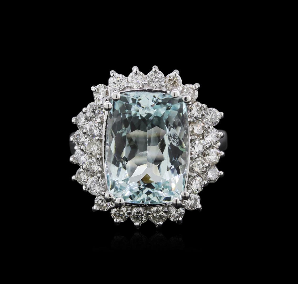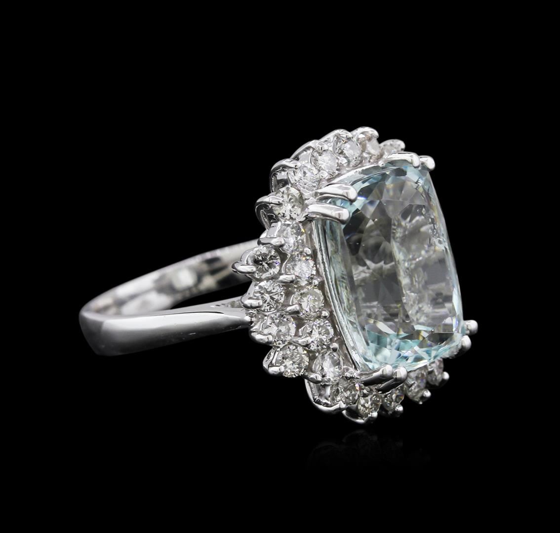 One electronically tested 14KT white gold ladies cast aquamarine and diamond ring with a bright polish finish. Identified with markings of "14K". Condition is new. Containing: One prong set rectangular cushion modified brilliant cut natural aquamarine, measuring 13.00 x 9.67 x 7.57mm, approximate weight of 6.08ct., clarity is eye clean, type I, light, slightly grayish, blue color, (GIA B 3/2), cut is good. Thirty prong set round brilliant cut diamonds, measuring 1.90 - 1.70 x 1.08mm (depth est.) approximate total weight of 30 Stones = 0.64ct. Clarity: SI-2 to I-2. Color: I - J, Cut is Good. All diamonds and colored gemstones are graded in the mounting, unless otherwise stated. Colored gemstones are presumed to have been subjected to commonly used enhancement processes. Total Weight of Colored Stones 6.08ct. Total Weight of Diamonds 0.64ct. Total Weight of Ring 8.00 grams. GGL Appraised at $4,655.00.