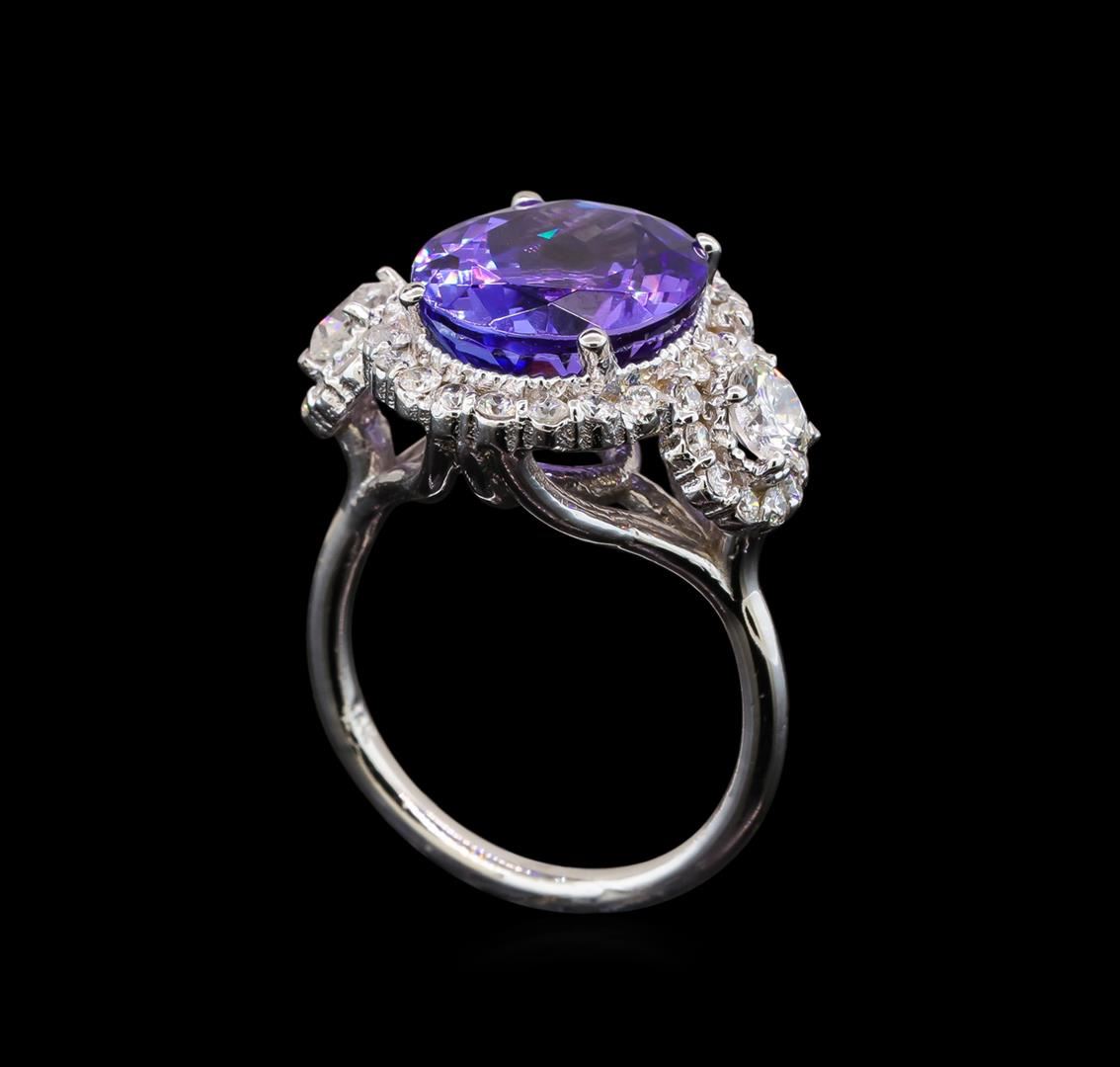 One electronically tested 14KT white gold ladies cast tanzanite and diamond ring with a bright polish finish. Identified with markings of "K14". Condition is new. Containing: One prong set oval modified brilliant cut natural tanzanite, measuring 12.40 x 10.50 x 6.70mm, approximate weight of 6.14ct., clarity is eye clean, type I, medium light, very slightly grayish, violet color, (GIA V 4/3), cut is good. Two prong set round brilliant cut diamonds, measuring 4.20 - 4.20 x 2.52mm (depth est.) approximate total weight of 2 Stones = 0.54ct. Clarity: SI-2. Color: I - J, Cut is Good. Forty prong set round brilliant cut diamonds, measuring 1.40 - 1.40 x 0.84mm (depth est.) approximate total weight of 40 Stones = 0.40 ct. Clarity: SI-2 to I-1. Color: I - J, Cut is Good. Colored gemstones are presumed to have been subjected to commonly used enhancement processes. All diamonds and colored gemstones are graded in the mounting, unless otherwise stated. Total Weight of Colored Stones 6.14ct. Total Weight of Diamonds 0.94ct. Total Weight of Ring 7.00 grams. GGL Appraised.