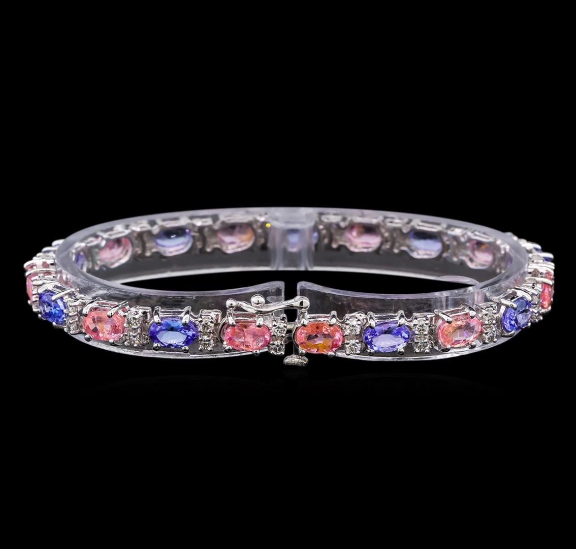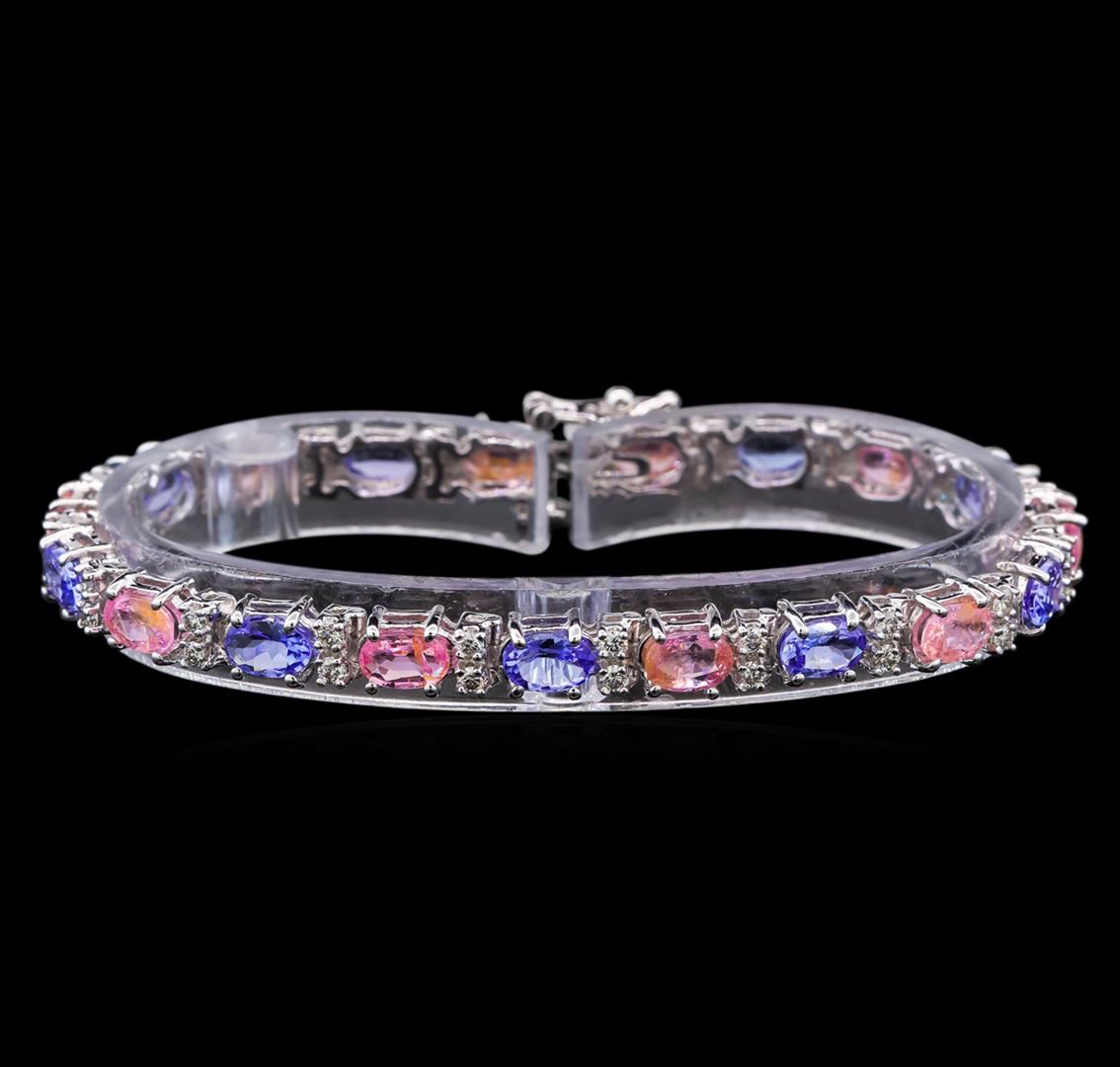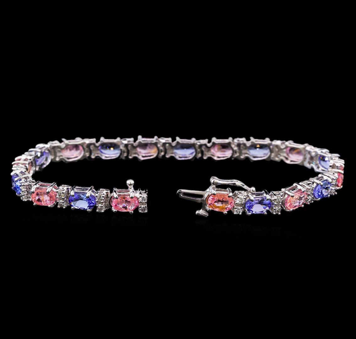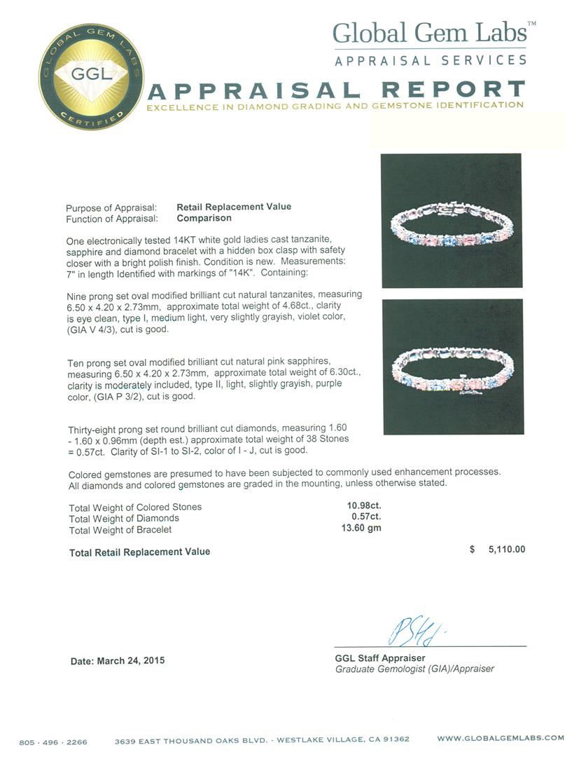 One electronically tested 14KT white gold ladies cast tanzanite, sapphire and diamond bracelet with a hidden box clasp with safety closer with a bright polish finish. Measurements: 7" in length Identified with markings of "14K". Condition is new. Containing: Nine prong set oval modified brilliant cut natural tanzanites, measuring 6.50 x 4.20 x 2.73mm, approximate total weight of 4.68ct., clarity is eye clean, type I, medium light, very slightly grayish, violet color, (GIA V 4/3), cut is good. Ten prong set oval modified brilliant cut natural pink sapphires, measuring 6.50 x 4.20 x 2.73mm, approximate total weight of 6.30ct., clarity is moderately included, type II, light, slightly grayish, purple color, (GIA P 3/2), cut is good. Thirty-Eight prong set round brilliant cut diamonds, measuring 1.60 - 1.60 x 0.96mm (depth est.) approximate total weight of 38 Stones = 0.57ct. Clarity: SI-1 to SI-2. Color: I - J, Cut is Good. Colored gemstones are presumed to have been subjected to commonly used enhancement processes. All diamonds and colored gemstones are graded in the mounting, unless otherwise stated. Total Weight of Colored Stones 10.98ct. Total Weight of Diamonds 0.57ct. Total Weight of Bracelet 13.60 grams. GGL Appraised.