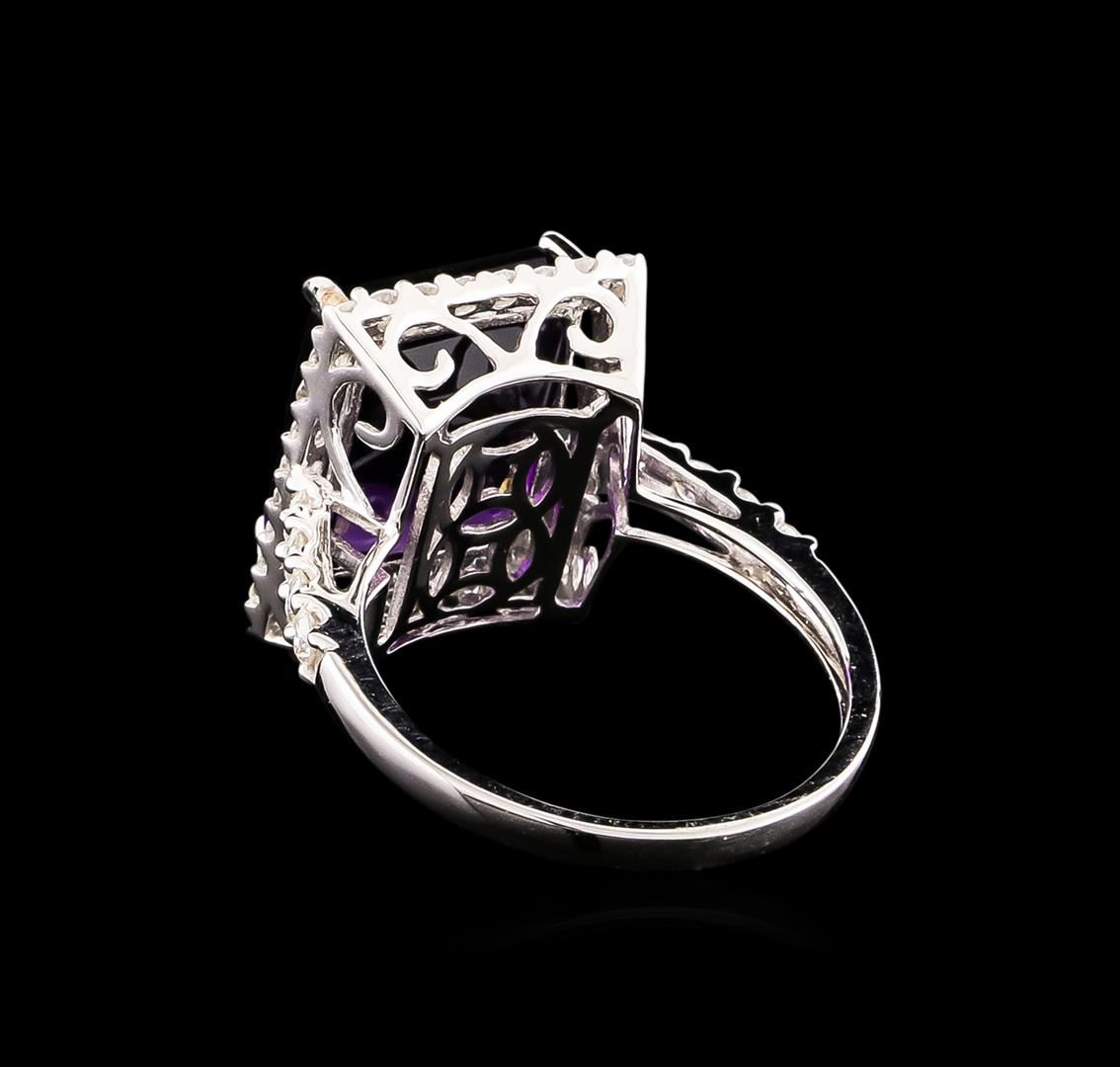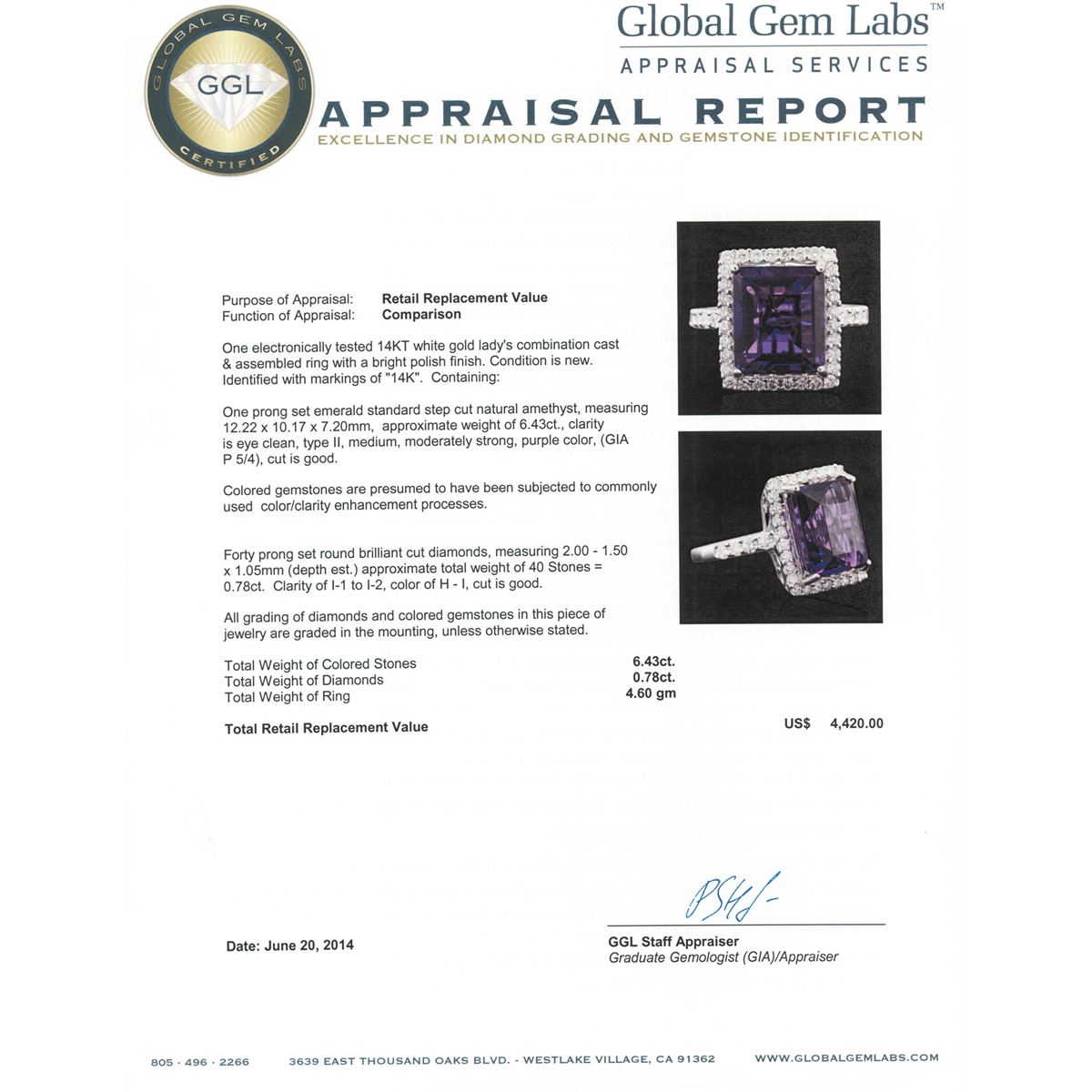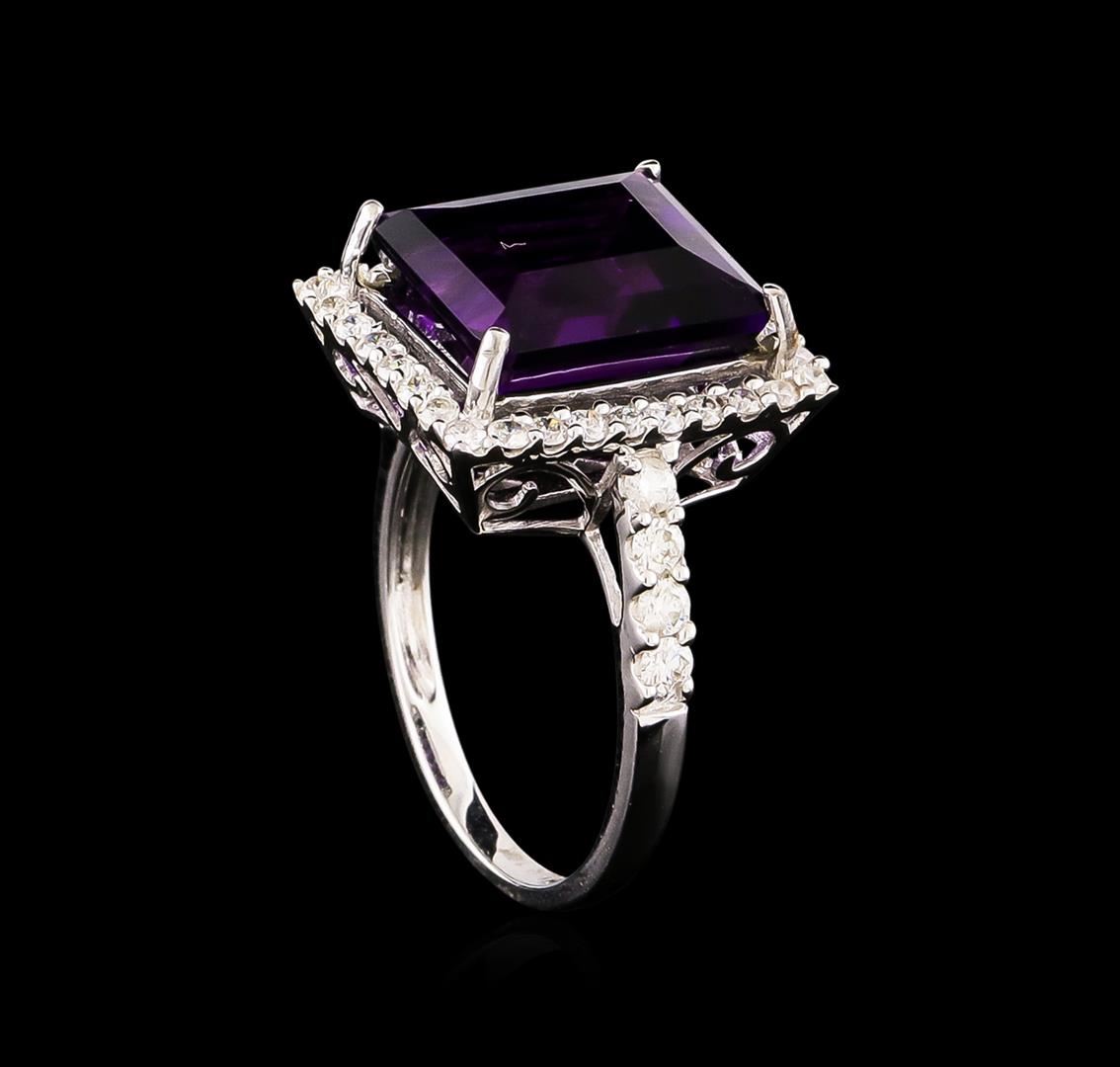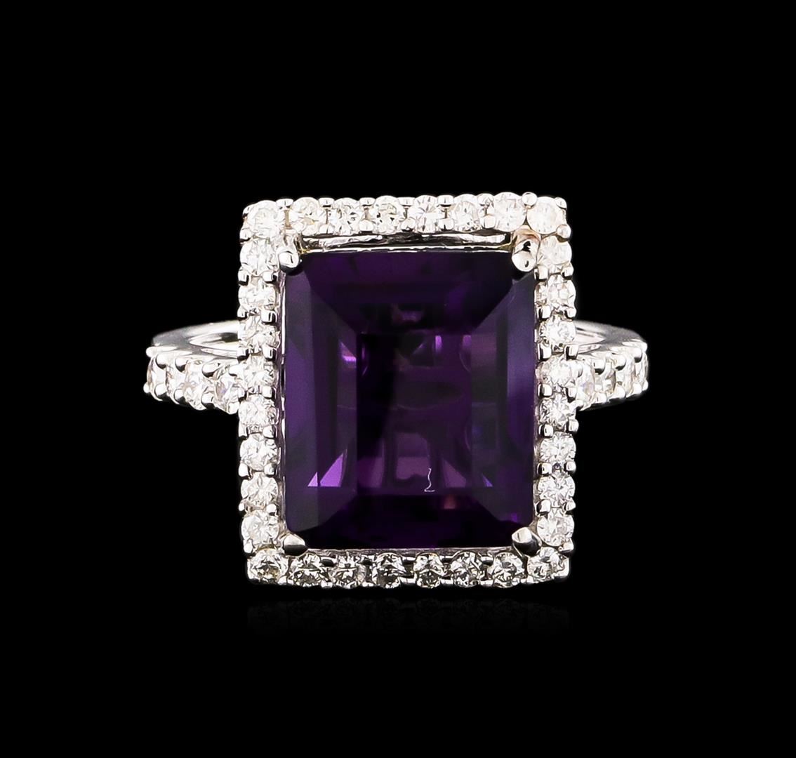 One electronically tested 14KT white gold Ladies combination cast & assembled ring with a bright polish finish. Condition is new. Identified with markings of "14K". Containing: One prong set emerald standard step cut natural amethyst, measuring 12.22 x 10.17 x 7.20mm, approximate weight of 6.43ct., clarity is eye clean, type II, medium, moderately strong, purple color, (GIA P 5/4), cut is good. Colored gemstones are presumed to have been subjected to commonly used color/clarity enhancement processes. Forty prong set round brilliant cut diamonds, measuring 2.00 - 1.50 x 1.05mm (depth est.) approximate. Total Weight of 40 Stones = 0.78ct. Clarity: I-1 to I-2. Color: H - I, Cut is Good. All grading of diamonds and colored gemstones in this piece of jewelry are graded in the mounting, unless otherwise stated. Total Weight of Colored Stones 6.43ct. Total Weight of Diamonds 0.78ct. Total Weight of Ring 4.60 grams. GGL Appraised at $4,420.00.