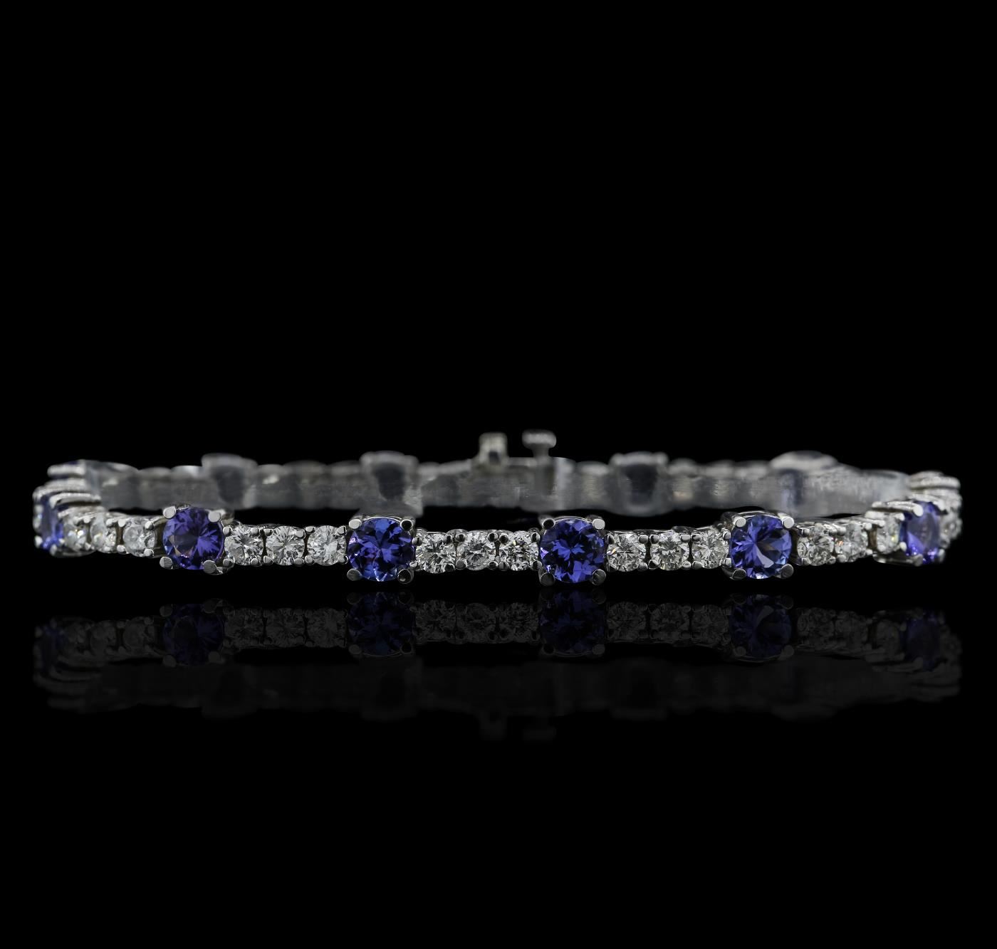One electronically tested 14KT white gold ladies combination cast & assembled tennis bracelet with a hidden box clasp with a bright polish finish. Condition is new. Measurements: 7" in length. Identified with markings of "14K". Containing: Twelve prong set round modified brilliant cut natural tanzanites, measuring 5.00 - 5.00 x 3.25 mm, approximate total weight of 6.48ct., clarity is eye clean, type I, medium light, moderately strong, bluish violet color, (GIA bV 4/4), cut is very good. Thirty-Eight prong set round brilliant cut diamonds, measuring 3.00 - 3.00 x 1.80mm (depth est.) approximate total weight of 38 Stones = 3.75ct. Clarity: SI-1 to I-1. Color: H - J, Cut is Good. Colored gemstones are presumed to have been subjected to commonly used enhancement processes. All diamonds and colored gemstones are graded in the mounting, unless otherwise stated. Total Weight of Colored Stones 6.48ct. Total Weight of Diamonds 3.75ct. Total Weight of Bracelet 15.40 grams. GGL Appraised at $14,310.00.