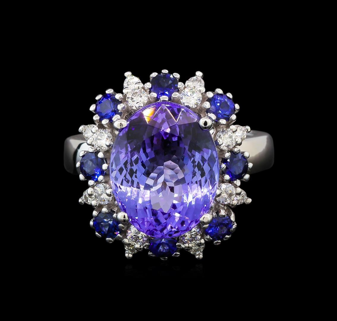 One electronically tested 14KT white gold ladies cast tanzanite, sapphire and diamond ring with a bright polish finish. Identified with markings of "K14". Condition is new. Containing: One prong set oval modified brilliant cut natural tanzanite, measuring 13.00 x 10.50 x 6.83mm, approximate weight of 6.56ct., clarity is eye clean, type I, light, very slightly grayish, violet color, (GIA V 3/3), cut is good. Eight prong set round modified brilliant cut natural blue sapphires, measuring 2.90 - 2.90 x 1.89 mm, approximate total weight of 1.04ct., clarity is eye clean, type II, medium, moderately strong, blue color, (GIA B 5/4), cut is good. Sixteen prong set round brilliant cut diamonds, measuring 1.80 - 1.50 x 0.99mm (depth est.) approximate total weight of 16 Stones = 0.26ct. Clarity: SI-1 to SI-2. Color: H - I, Cut is Good. Colored gemstones are presumed to have been subjected to commonly used enhancement processes. All diamonds and colored gemstones are graded in the mounting, unless otherwise stated. Total Weight of Colored Stones 7.60 ct. Total Weight of Diamonds 0.26ct. Total Weight of Ring 8.00 grams. GGL Appraised.