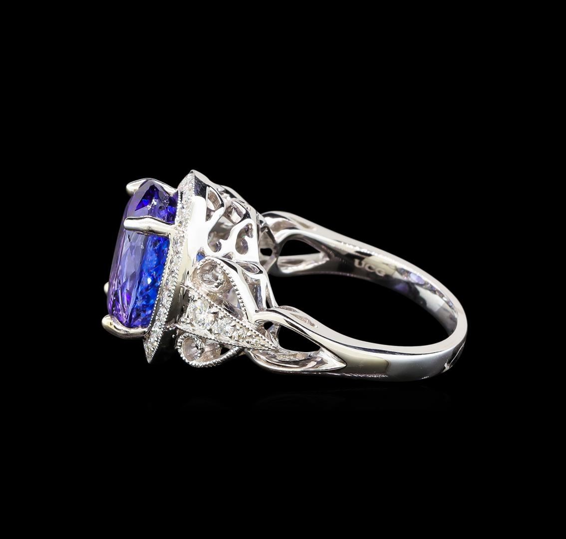 One electronically tested 14KT white gold ladies cast tanzanite and diamond ring with a bright polish finish. Identified with markings of "14K". Condition is new. Containing: One prong set oval modified brilliant cut natural tanzanite, measuring 12.80 x 10.60 x 6.90mm, approximate weight of 6.59ct., clarity is eye clean, type I, medium, moderately strong, violet color, (GIA V 5/4), cut is good. Two prong set round brilliant cut diamonds, measuring 2.40 - 2.40 x 1.44mm (depth est.) approximate total weight of 2 Stones = 0.10ct. Clarity: SI-1 to SI-2. Color: I - J, Cut is Good. Thirty-Six prong set round brilliant cut diamonds, measuring 1.30 - 1.30 x 0.78mm (depth est.) approximate total weight of 36 Stones = 0.29ct. Clarity: SI-1 to SI-2. Color: I - J, Cut is Good. Colored gemstones are presumed to have been subjected to commonly used enhancement processes. All diamonds and colored gemstones are graded in the mounting, unless otherwise stated. Total Weight of Colored Stones 6.59ct. Total Weight of Diamonds 0.39ct. Total Weight of Ring 8.60 grams. GGL Appraised.