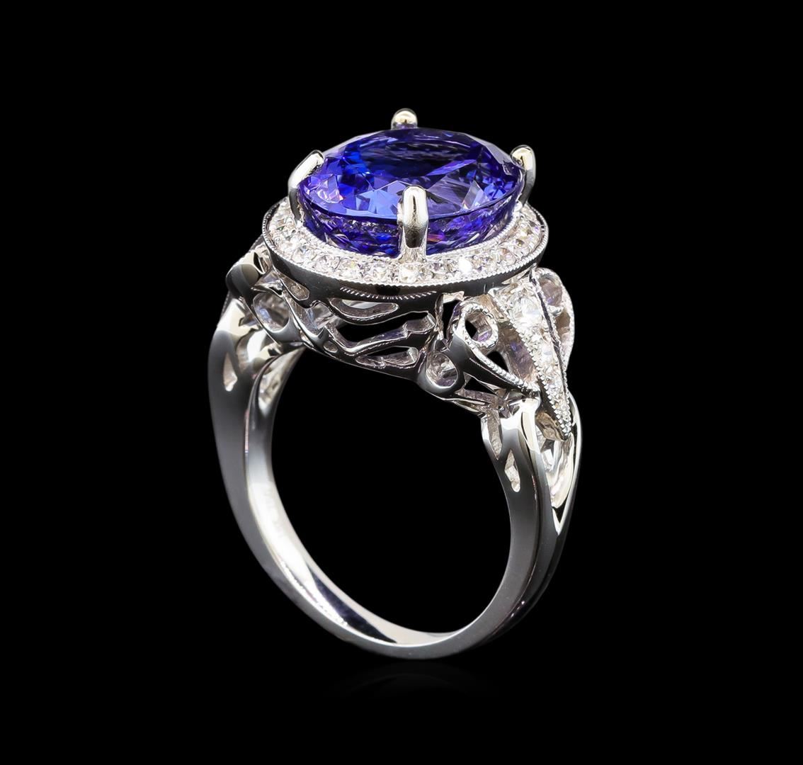 One electronically tested 14KT white gold ladies cast tanzanite and diamond ring with a bright polish finish. Identified with markings of "14K". Condition is new. Containing: One prong set oval modified brilliant cut natural tanzanite, measuring 12.80 x 10.60 x 6.90mm, approximate weight of 6.59ct., clarity is eye clean, type I, medium, moderately strong, violet color, (GIA V 5/4), cut is good. Two prong set round brilliant cut diamonds, measuring 2.40 - 2.40 x 1.44mm (depth est.) approximate total weight of 2 Stones = 0.10 ct. Clarity: SI-1 to SI-2. Color: I - J, Cut is Good. Thirty-Six prong set round brilliant cut diamonds, measuring 1.30 - 1.30 x 0.78mm (depth est.) approximate total weight of 36 Stones = 0.29ct. Clarity: SI-1 to SI-2. Color: I - J, Cut is Good. Colored gemstones are presumed to have been subjected to commonly used enhancement processes. All diamonds and colored gemstones are graded in the mounting, unless otherwise stated. Total Weight of Colored Stones 6.59ct. Total Weight of Diamonds 0.39ct. Total Weight of Ring 8.60 grams. GGL Appraised.