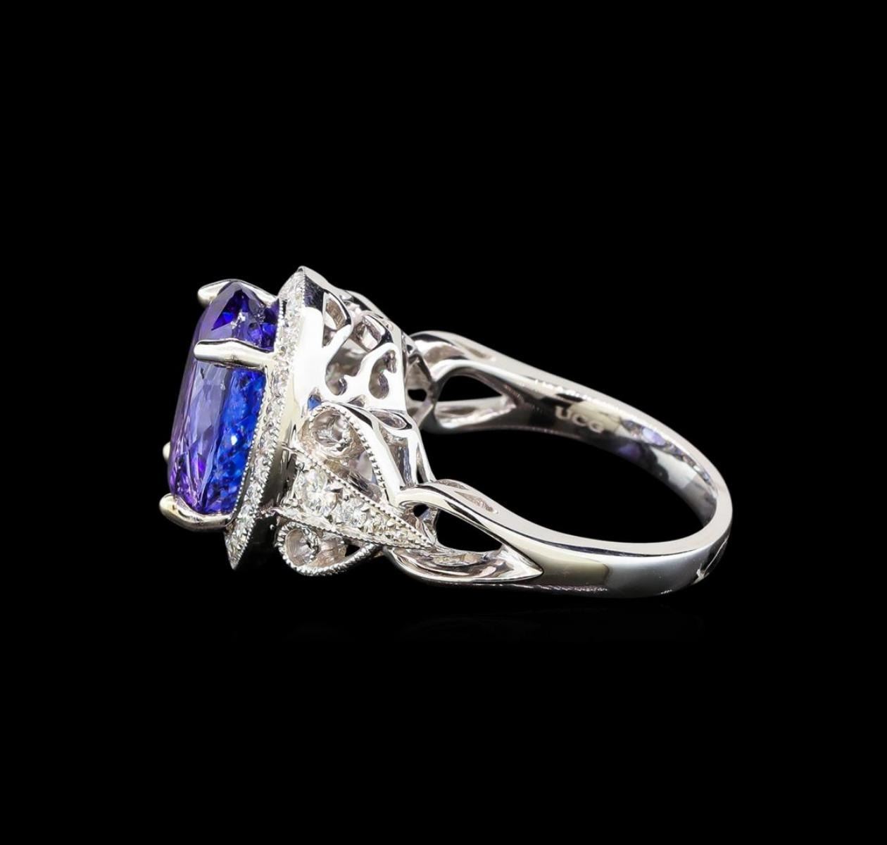 One electronically tested 14KT white gold ladies cast tanzanite and diamond ring with a bright polish finish. Identified with markings of "14K". Condition is new. Containing: One prong set oval modified brilliant cut natural tanzanite, measuring 12.80 x 10.60 x 6.90mm, approximate weight of 6.59ct., clarity is eye clean, type I, medium, moderately strong, violet color, (GIA V 5/4), cut is good. Two prong set round brilliant cut diamonds, measuring 2.40 - 2.40 x 1.44mm (depth est.) approximate total weight of 2 Stones = 0.10 ct. Clarity: SI-1 to SI-2. Color: I - J, Cut is Good. Thirty-Six prong set round brilliant cut diamonds, measuring 1.30 - 1.30 x 0.78mm (depth est.) approximate total weight of 36 Stones = 0.29ct. Clarity: SI-1 to SI-2. Color: I - J, Cut is Good. Colored gemstones are presumed to have been subjected to commonly used enhancement processes. All diamonds and colored gemstones are graded in the mounting, unless otherwise stated. Total Weight of Colored Stones 6.59ct. Total Weight of Diamonds 0.39ct. Total Weight of Ring 8.60 grams. GGL Appraised.