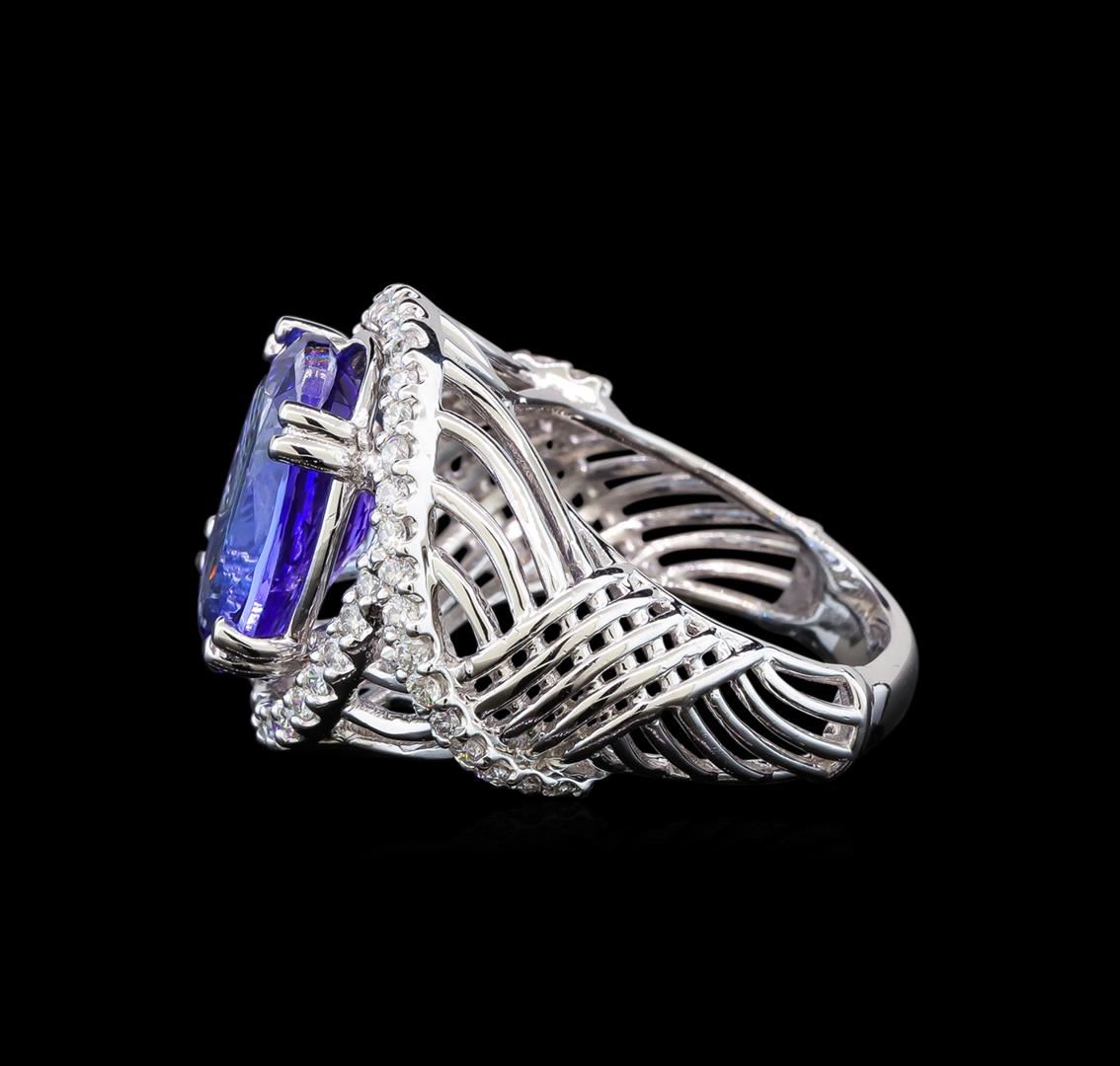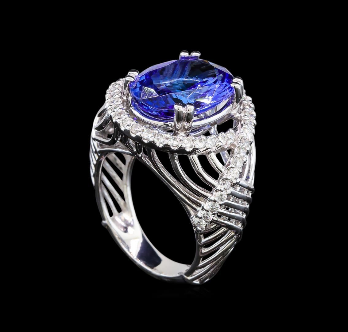 One electronically tested 14KT white gold ladies cast tanzanite and diamond ring with a bright polish finish. Identified with markings of "14K". Condition is new. Containing: One prong set oval oval modified brilliant cut natural tanzanite, measuring 14.80 x 11.10 x 5.86mm, approximate weight of 6.77ct., clarity is eye clean, type I, medium light, very slightly grayish, violet color, (GIA V 4/3), cut is good. Fifty prong set round brilliant cut diamonds, measuring 1.50 - 1.50 x 0.90mm (depth est.) approximate total weight of 50 Stones = 0.62ct. Clarity: SI-1 to I-1. Color: I - J, Cut is Good. Colored gemstones are presumed to have been subjected to commonly used enhancement processes. All diamonds and colored gemstones are graded in the mounting, unless otherwise stated. Total Weight of Colored Stones 6.77ct. Total Weight of Diamonds 0.62ct. Total Weight of Ring 10.70 grams. GGL Appraised.