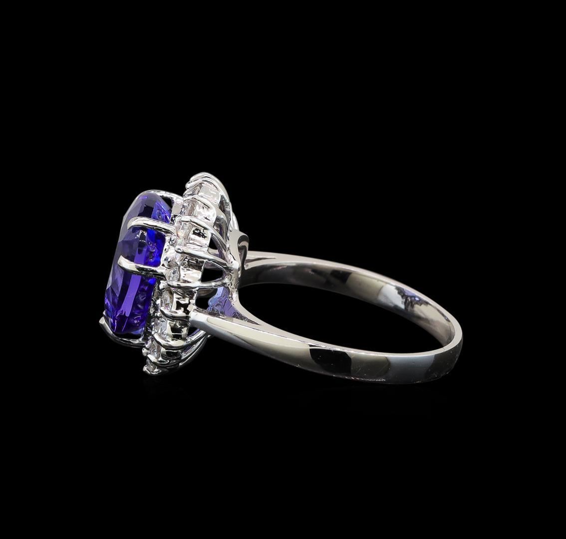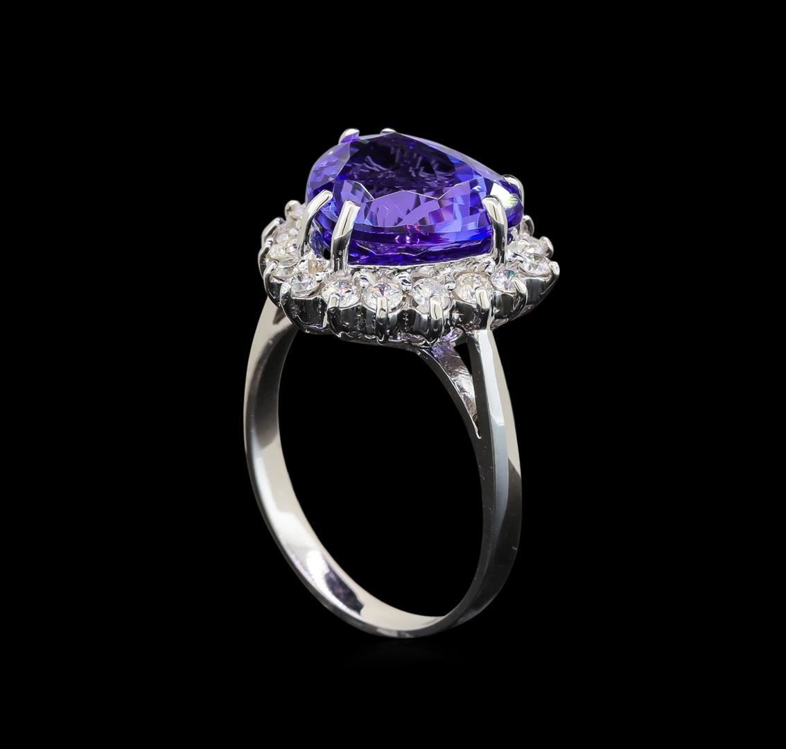 One electronically tested 14KT white gold ladies cast tanzanite and diamond ring with a bright polish finish. Identified with markings of "14K". Condition is new. Containing: One prong set triangle modified brilliant cut natural tanzanite, measuring 12.00. x 12.00. x 7.81mm, approximate weight of 6.78ct., clarity is eye clean, type I, medium light, very slightly grayish, bluish violet color, (GIA bV 4/3), cut is good. Twenty prong set round brilliant cut diamonds, measuring 2.00. - 2.00. x 1.20mm (depth est.) approximate total weight of 20 Stones = 0.58ct. Clarity: SI-1 to SI-2. Color: I - J. All diamonds and colored gemstones are graded in the mounting, unless otherwise stated. Colored gemstones are presumed to have been subjected to commonly used enhancement processes. Total Weight of Colored Stones 6.78ct. Total Weight of Diamonds 0.58ct. Total Weight of Ring 5.00. grams. GGL Appraised.