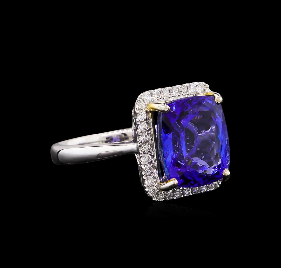 One electronically tested 14KT white gold Ladies combination cast & assembled ring with a bright polish finish. Condition is new. Identified with markings of "14K". Containing: One prong set rectangular cushion modified brilliant cut natural tanzanite, measuring 11.50 x 10.50 x 7.15mm, approximate weight of 6.80ct., clarity is eye clean, type I, medium, moderately strong, violetish blue color, (GIA vB 5/4), cut is good. Colored gemstones are presumed to have been subjected to commonly used color/clarity enhancement processes. Thirty prong set round brilliant cut diamonds, measuring 1.40 - 1.40 x 0.84mm (depth est.) approximate. Total Weight of 30 Stones = 0.30ct. Clarity: I-1 to I-2. Color: I - J, Cut is Good. Total Weight of Colored Stones 6.80ct. Total Weight of Diamonds 0.30ct. Total Weight of Ring 5.90 grams. GGL Appraised at $11,755.00.