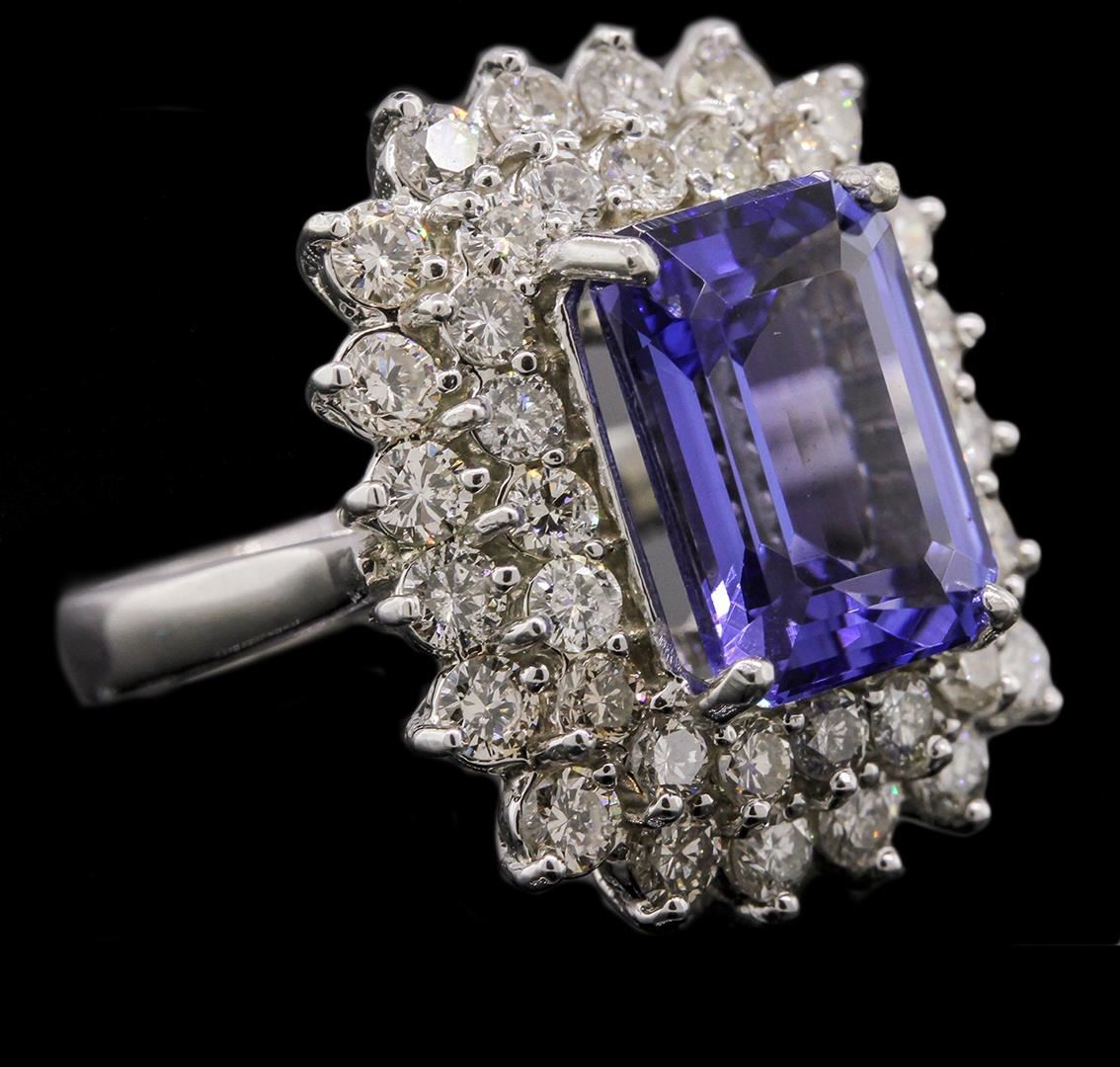 One electronically tested 14KT white gold Ladies combination cast & assembled ring with a bright polish finish. Condition is new. Identified with markings of "K14". Containing: One prong set emerald standard step cut natural tanzanite, measuring 12.79 x 9.43 x 6.35mm, approximate weight of 6.93ct., clarity is eye clean, type I, medium light, moderately strong, bluish violet color, (GIA bV 4/4), cut is very good. Colored gemstones are presumed to have been subjected to commonly used color/clarity enhancement processes. Twenty prong set round brilliant cut diamonds, measuring 2.80 - 2.80 x 1.68mm (depth est.) approximate. Total Weight of 20 Stones = 1.61ct. Clarity: SI-2 to I-1. Color: J - K, Cut is Good. Twenty prong set round brilliant cut diamonds, measuring 2.10 - 2.10 x 1.26mm (depth est.) approximate. Total Weight of 20 Stones = 0.68ct. Clarity: I-1 to I-2. Color: J - K, Cut is Good. Total Weight of Colored Stones 6.93ct. Total Weight of Diamonds 2.28ct. Total Weight of Ring 10.90 grams. GGL Appraised at $17,275.00.