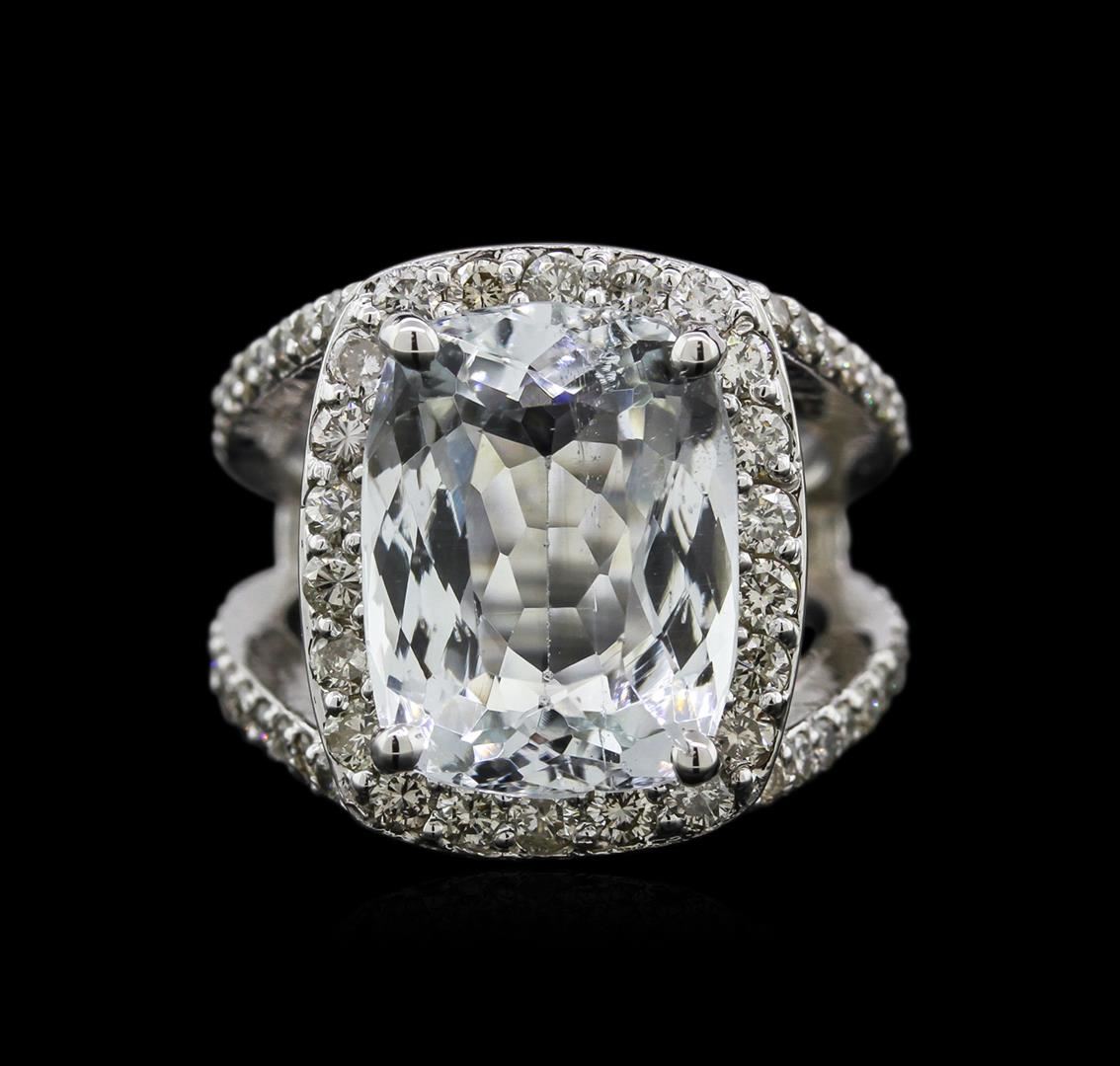 One electronically tested 14KT white gold ladies cast aquamarine and diamond ring with a split shank with a bright polish finish. Identified with markings of "K14". Condition is new. Containing: One prong set rectangular cushion modified brilliant cut natural aquamarine, measuring 14.48 x 10.99 x 6.95mm, approximate weight of 7.07ct., clarity is eye clean, type I, very light, slightly grayish, blue color, (GIA B 2/2), cut is good. Sixty-Six prong set round brilliant cut diamonds, measuring 1.70 - 1.70 x 1.02mm (depth est.) approximate total weight of 66 Stones = 1.18ct. Clarity: SI-1 to I-1. Color: I - J, Cut is Good. Diamonds and colored gemstones are graded in the mounting, unless otherwise stated. Colored gemstones are presumed to have been subjected to commonly used enhancement processes. Total Weight of Colored Stones 7.07ct. Total Weight of Diamonds 1.18ct. Total Weight of Ring 10.70 grams. GGL Appraised at $4,475.00.