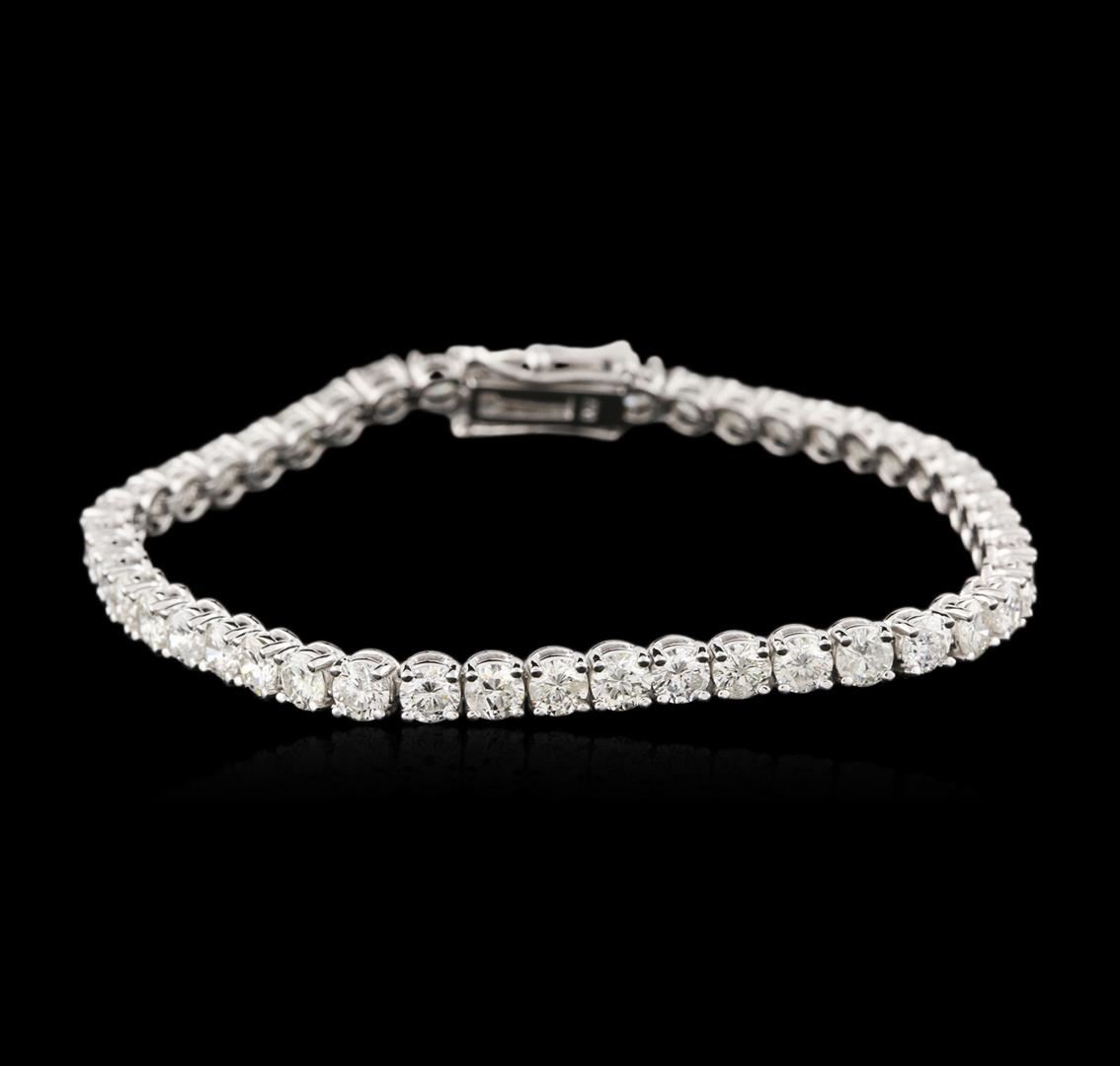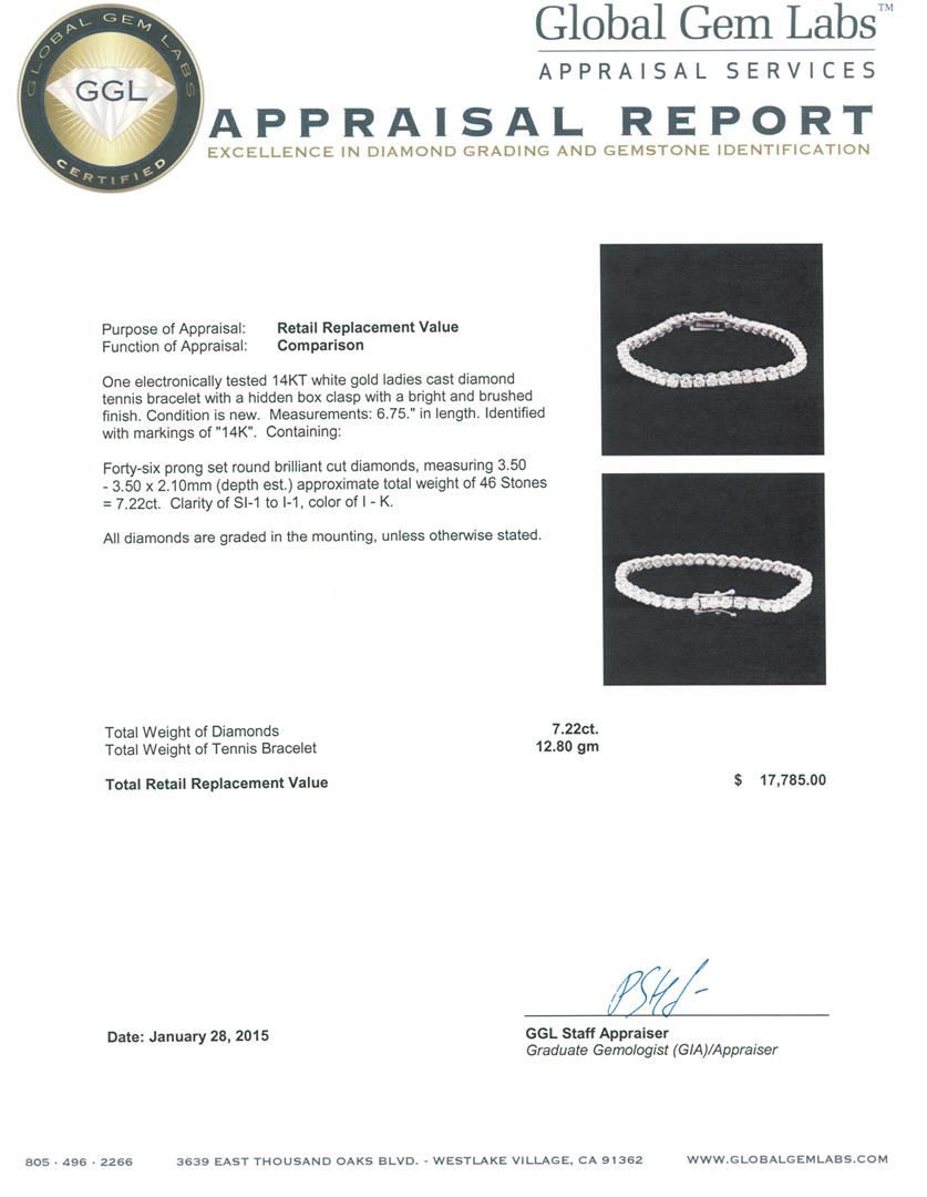 One electronically tested 14KT white gold ladies cast diamond tennis bracelet with a hidden box clasp with a bright and brushed finish. Measurements: 6.75." in length. Identified with markings of "14K". Condition is new. Containing: Forty-Six prong set round brilliant cut diamonds, measuring 3.50 - 3.50 x 2.10mm (depth est.) approximate total weight of 46 Stones = 7.22ct. Clarity: SI-1 to I-1. Color: I - K. All diamonds are graded in the mounting, unless otherwise stated. Total Weight of Diamonds 7.22ct. Total Weight of Tennis Bracelet 12.80 grams. GGL Appraised at $17,785.00.