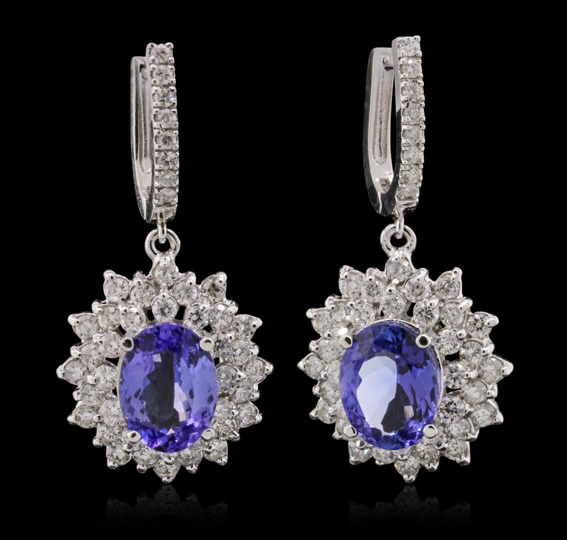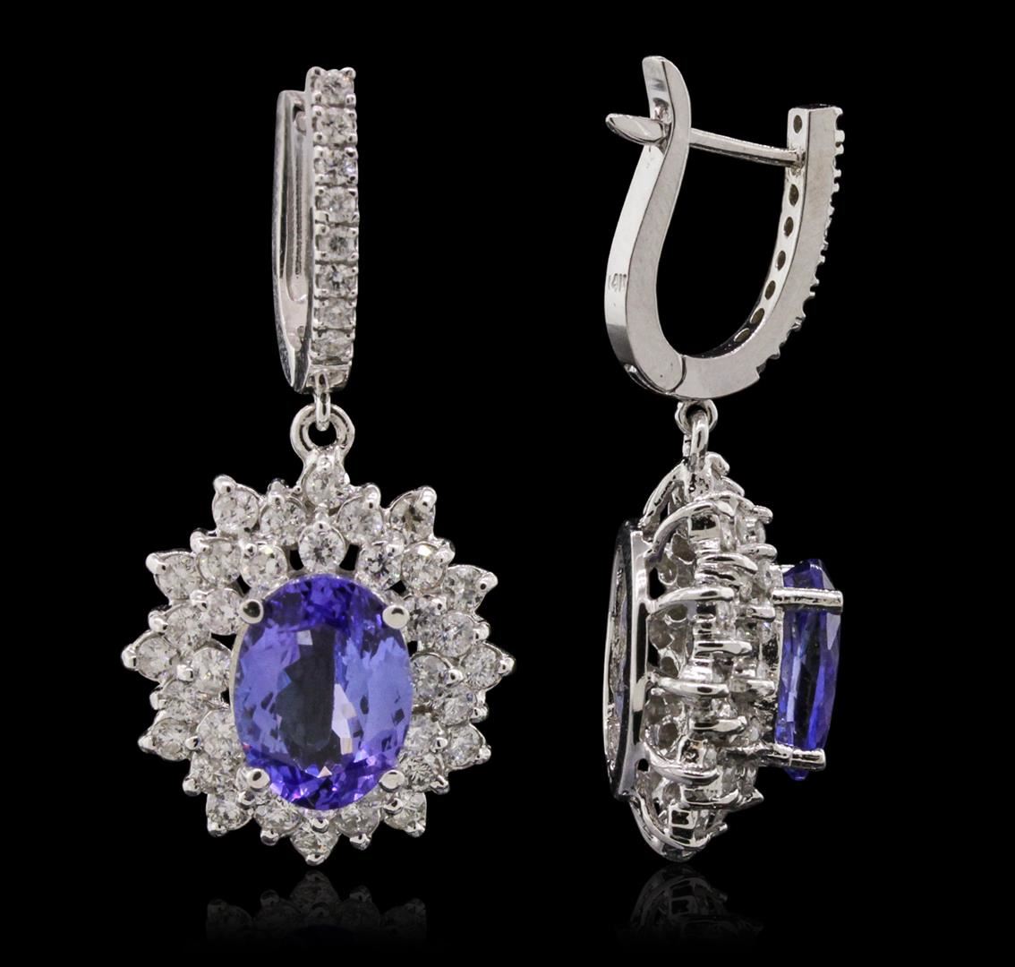 One pair electronically tested 14KT white gold ladies cast & assembled tanzanite and diamond dangle earrings with hinged, snap locking posts. Bright polish finish. Condition is new, good workmanship. Identified with markings of "14K". Containing: Two prong set oval brilliant cut natural tanzanites, measuring 11.60 x 8.50 x 5.10mm, 8%. bulge factor, approximate. Total Weight of 7.46ct., clarity is eye clean, type I, medium dark, very slightly grayish, bluish violet color, (GIA bV 6/3), cut is good. Transmitting light with no distortion, transparent. Measurements & the color grade are an average for the pair. Graded in the setting.Tanzanite is a very rare gemstone that is only found in the country of Tanzania. Originally discovered in 1967. Tiffany & Company, named the stone Tanzanite. It is found in the Usumburu Mountains that border the Umba Valley of northern Tanzania. Tanzanite occurs in gray, brown, violet, blue, reddish-purple, & green. The gem is interesting because of its exceptional pleochroism. Rotated in different directions a tanzanite will exhibit multiple changes of color. Tanzanite has a low tolerance to ultrasonic cleaning, and should not be cleaned using this method. Eighty-Eight prong set round brilliant cut diamonds, measuring 2.20 - 1.90 x 1.23mm (depth est.) approximate. Total Weight of 88 Stones = 2.87ct. Graded in the setting. Clarity: SI-2 to I-2. Color: G - I. Total Weight of Colored Stones 7.46ct. Total Weight of Diamonds 2.87ct. Total Weight of Earrings 13.72gm. AIG Appraised at $23,295.00.
